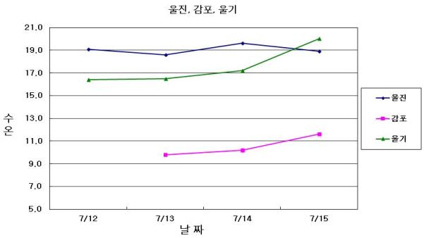 ◦ 2012년 07월 15일 17시를 기해 감포연안 냉수대 경보를 발령합니다. ◦ 아래 그림은 2013년 07월 12일부터 7월 15까지의 울진, 감포, 울기연안의 일별 수온변화 입니다.
