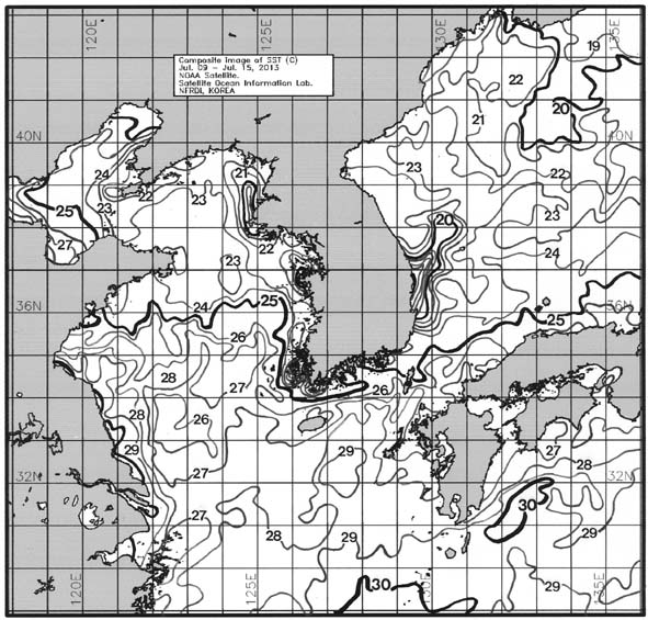 ◦ 금주(2013. 07. 09~2013. 07. 15)의 한국근해 표면수온은 대화퇴 근해 21~22도, 울릉도-독도 근해 23~24도, 대마도 근해 25~26도, 제주도 근해 25~27도, 이어도 근해 27~28도, 가거초 근해 25~26도, 어청도 근해 23~25도, 백령도 근해 19∼20도로 나타납니다. ◦「평년에 비해」대화퇴 근해 비슷하게, 울릉도-독도 근해 0.8도 높게, 대마도 근해 1.1도 높게, 제주도 근해 1.3도 높게, 이어도 근해 1.2도 높게, 가거초 근해 1.7도 높게, 어청도 근해 1.5도 높게 나타납니다. ◦「전년에 비해」대화퇴 근해 1도 높게, 울릉도-독도 근해 0.5도 높게, 대마도 근해 1.5도 높게, 제주도 근해 2.5도 높게, 이어도 근해 2.5도 높게, 가거초 근해 1.5도 높게, 어청도 2.5도 높게, 백령도 근해 0.5도 높게 나타납니다. ◦ 수온 전선대는 우리나라 제주해협에서 대한해협까지 26도를 중심으로 형성됩니다. |
