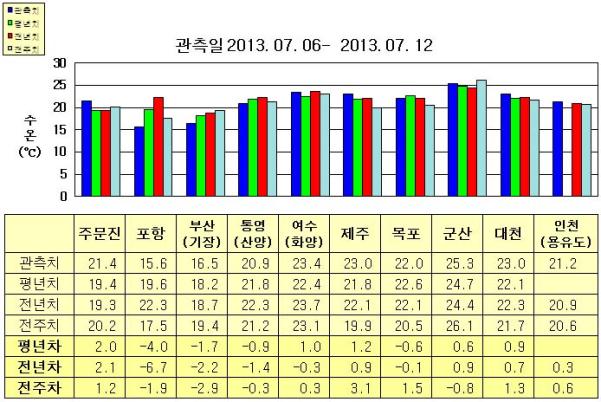 ◦ 금주(2013. 07. 06~2013. 07. 12)의 한반도 연안 표면수온은 동해 연안역에서 섭씨 15.5~21.5도, 남해 연안역 20.5~23.5도, 서해 연안역에서 21.0~25.5도로 나타납니다. ◦ 평년에 비해 주문진 2도 높음을 제외한 동해 연안역은 1.5~4.0도 낮게, 통영(산양) 0.9도 낮음을 제외한 남해 연안역은 1.0∼1.5도 높게, 목포 0.6도 낮음을 제외한 서해 연안역은 0.5~1.0도 높게 나타납니다. ◦ 전년에 비해 주문진 2.1도 높음을 제외한 동해 연안역은 2~7도 낮게, 남해 연안역은 통영(산양) 0.9도 낮게, 여수(화양) 비슷하게, 제주 1.2도 높게 나타나며, 목포․인천(용유도) 비슷함을 제외한 서해 연안역은 0.5~1.0도 높게 나타납니다. |