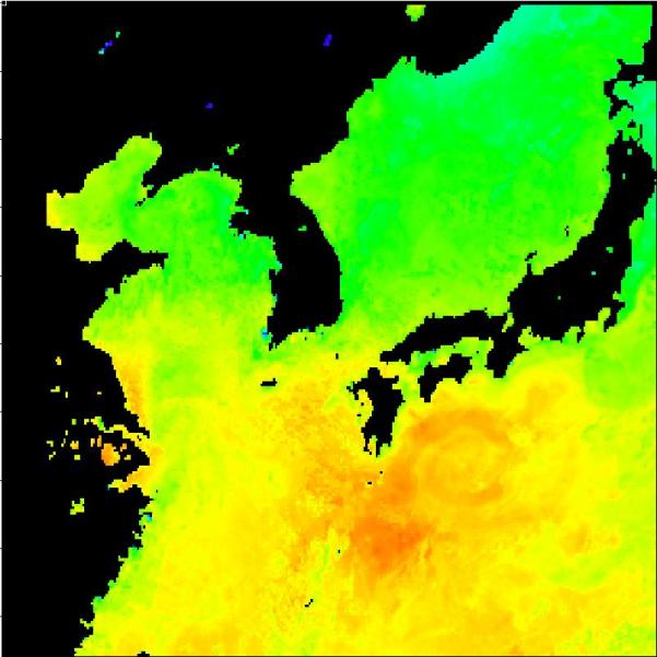 국립수산과학원 위성해양정보실에서 연구중인 2013년 07월 18일 구름이 배제된 수온 영상입니다.