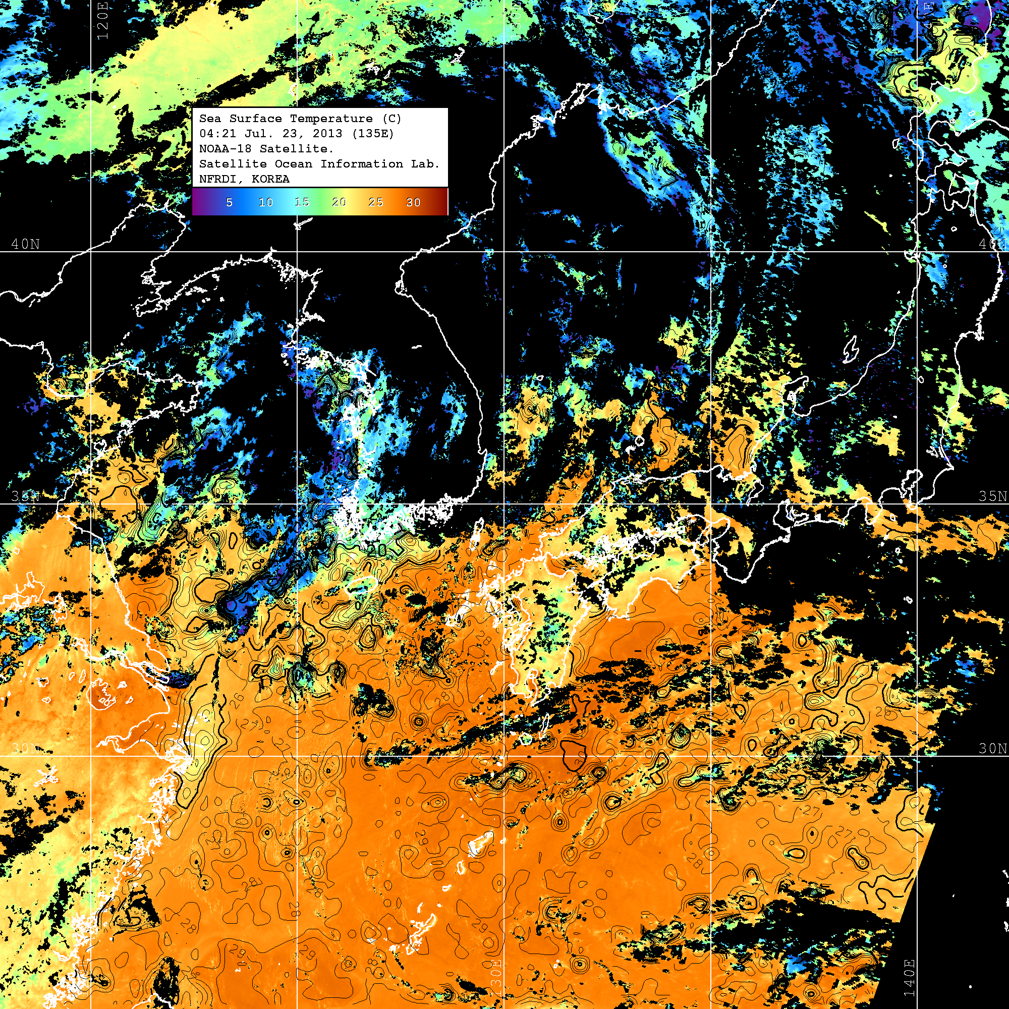 o 2013년 07월 23일 NOAA 위성영상입니다. o 영상 시간 및 수온분포는 범례를 참고하시기 바랍니다. o 검은색은 구름을 나타냅니다. o 그림을 클릭하시면 크게 보실 수 있습니다.