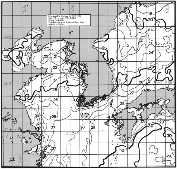 ◦ 금주(2013. 07. 16~2013. 07. 22)의 한국근해 표면수온은 대화퇴 근해 22~23도, 울릉도-독도 근해 23~24도, 대마도 근해 27~28도, 제주도 근해 27~28도, 이어도 근해 27~28도, 가거초 근해 26~27도, 어청도 근해 24~25도, 백령도 근해 19∼21도로 나타납니다. ◦「평년에 비해」대화퇴 근해 1도 높게, 울릉도-독도 근해 1.7도 높게, 대마도 근해 3.4도 높게, 제주도 근해 3.1도 높게, 이어도 근해 1도 높게, 가거초 근해 2.1도 높게, 어청도 근해 2.3도 높게 나타납니다. ◦「전년에 비해」대화퇴 근해 1.5도 높게, 울릉도-독도 근해 비슷하게, 대마도 근해 2도 높게, 제주도 근해 2.5도 높게, 이어도 근해 1도 낮게, 가거초 근해 비슷하게, 어청도 1.5도 높게, 백령도 근해 1도 낮게 나타납니다. ◦ 수온 전선대는 우리나라 제주해협에서 대한해협까지 27도를 중심으로 형성됩니다. =$row['content']?> =$row['content']?> =$row['content']?> |