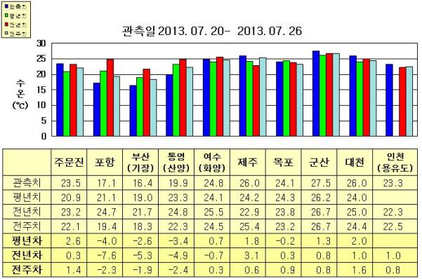 ◦ 금주(2013. 07. 20~2013. 07. 26)의 한반도 연안 표면수온은 동해 연안역에서 섭씨 16.0~23.5도, 남해 연안역 19.5~26.0도, 서해 연안역에서 23.0~27.5도로 나타납니다. ◦ 평년에 비해 주문진 2.6도 높음을 제외한 동해 연안역은 2.5∼4.0도 낮게, 통영(산양) 3.4도 낮음을 제외한 남해 연안역은 0.5∼2.0도 높게, 목포 비슷함을 제외한 서해 연안역은 1∼2도 높게 나타납니다. ◦ 전년에 비해 주문진 비슷함을 제외한 동해 연안역은 5~8도 낮게, 제주 3.1도 높음을 제외한 남해 연안역은 0.5∼5.0도 낮게, 목포 비슷함을 제외한 서해 연안역은 0.5~1.0도 높게 나타납니다. |