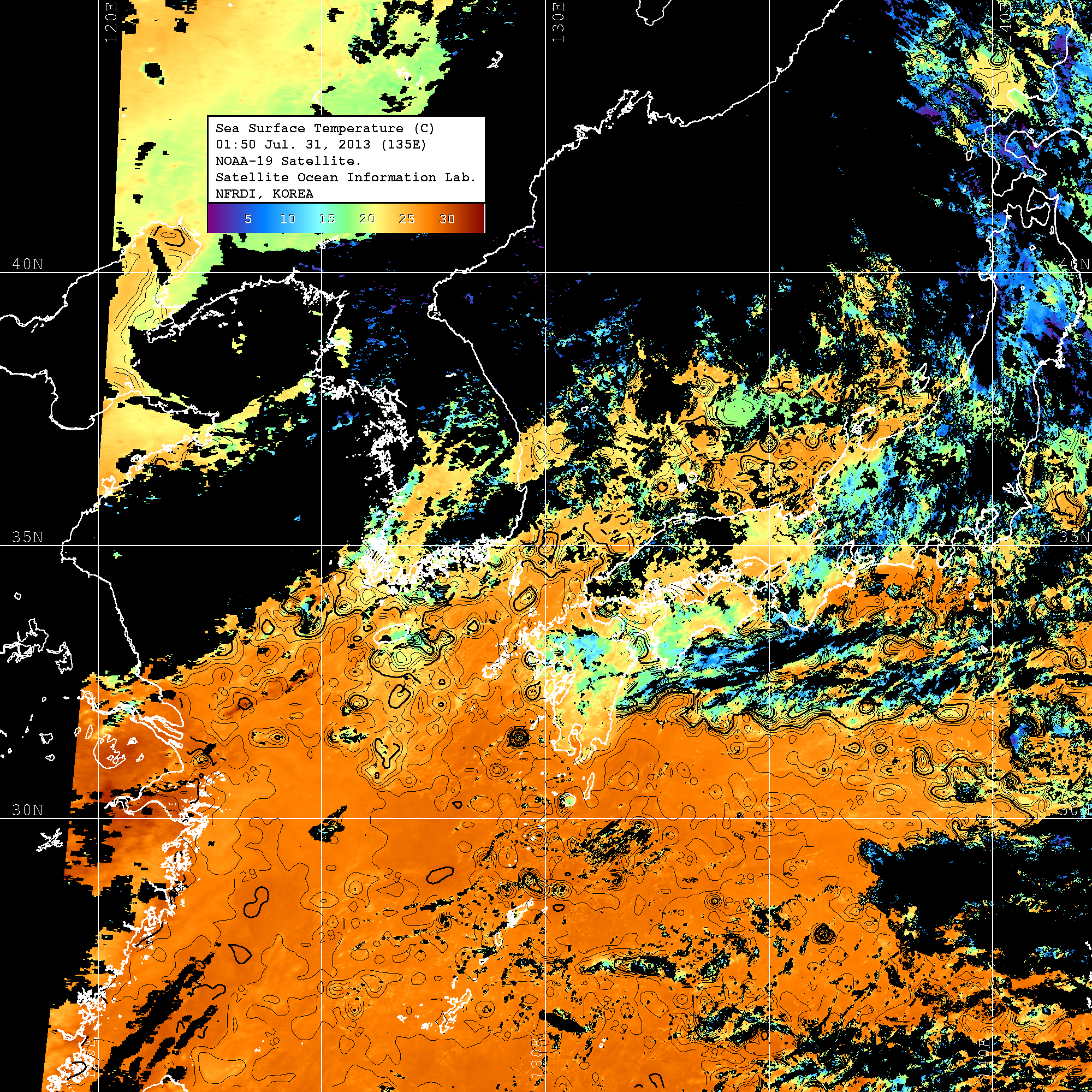 o 2013년 07월 31일 NOAA 위성영상입니다. o 영상 시간 및 수온분포는 범례를 참고하시기 바랍니다. o 검은색은 구름을 나타냅니다. o 그림을 클릭하시면 크게 보실 수 있습니다.