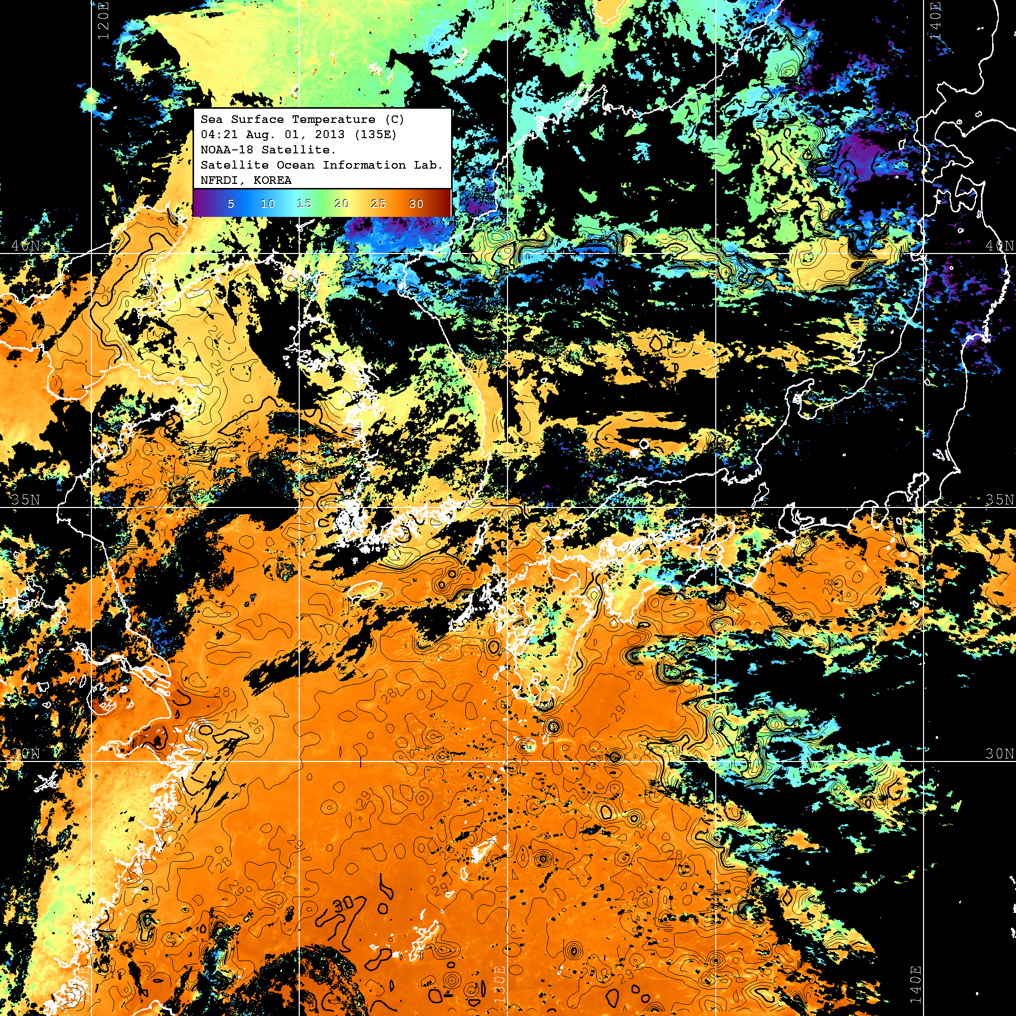 o 2013년 80월 01일 NOAA 위성영상입니다. o 영상 시간 및 수온분포는 범례를 참고하시기 바랍니다. o 검은색은 구름을 나타냅니다. o 그림을 클릭하시면 크게 보실 수 있습니다.