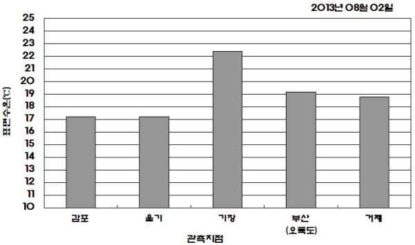◦ 2013년 08월 02일 16시를 기해 기장 연안 냉수대 주의보를 해제합니다. ◦ 2013년 08월 02일 오전 10시에 관측된 현장 표면수온은 감포 섭씨 17.2도, 울기 17.2도, 기장 22.4도, 부산(오륙도) 19.2도, 거제 18.8도의 수온을 나타내고 있습니다. ◦ 냉수대 소멸로 수온이 급상승함에 따라 양식생물이 피해를 입을 수 있으니 주의하여 주시기 바랍니다.