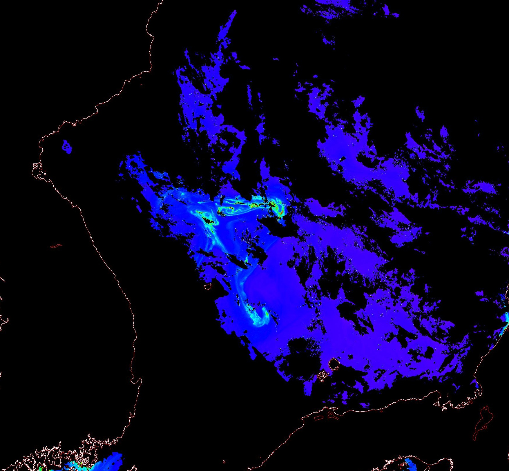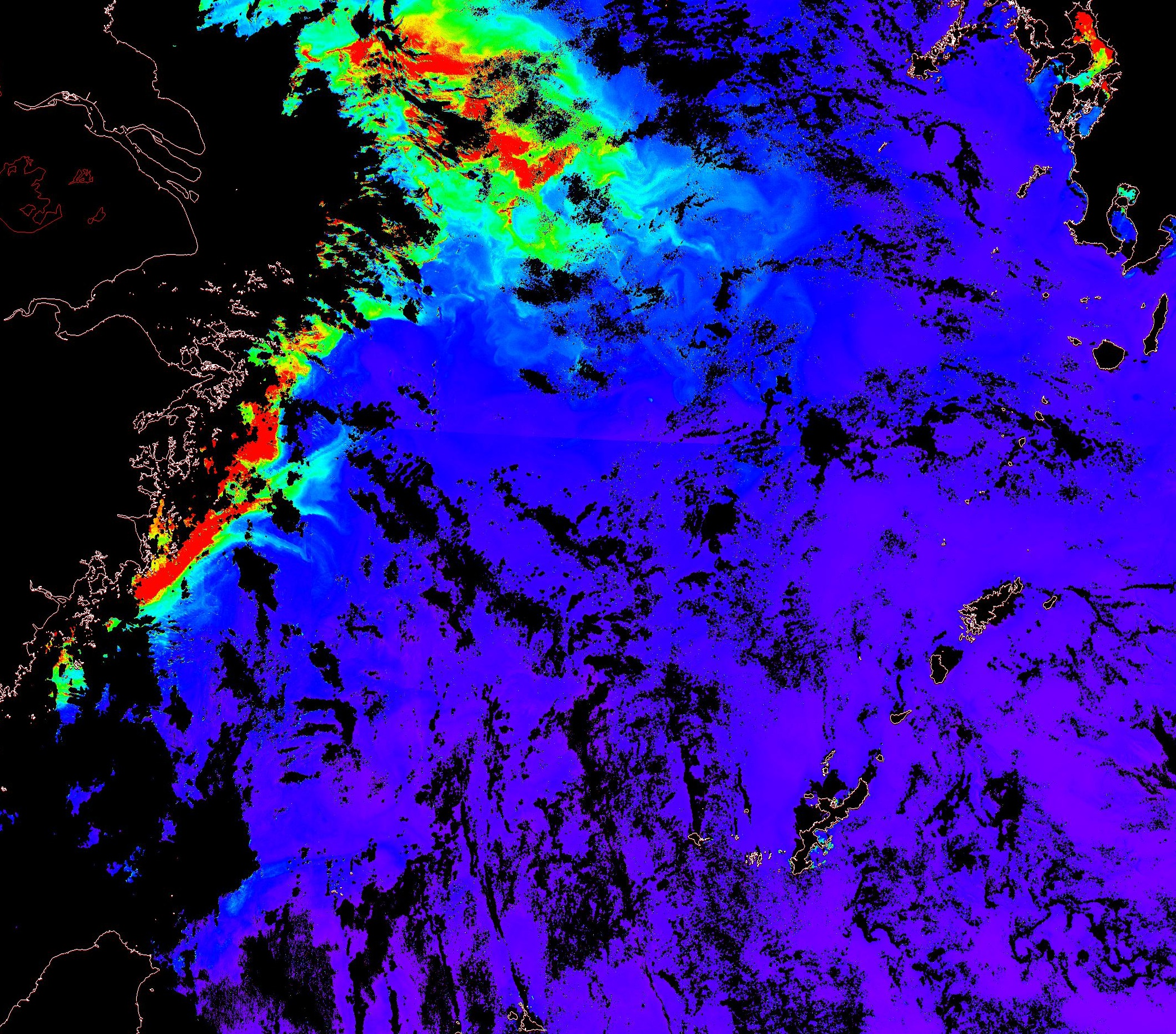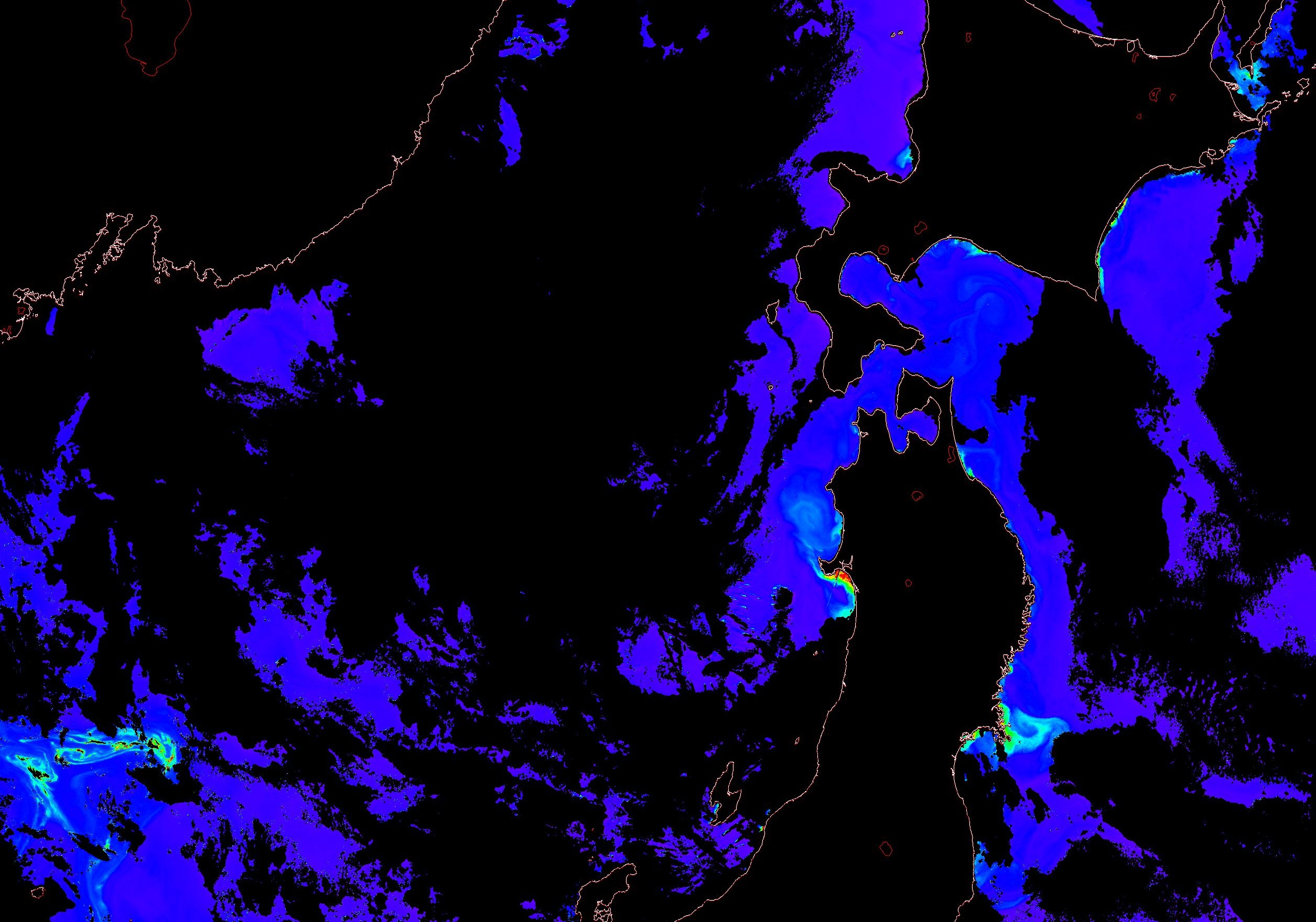 o 2013년 08월 02일 천리안 GOCI 위성영상입니다. [ GOCI : Geostationary Ocean Color Imager ] o 농도분포는 하단 범례를 참고하시기 바랍니다. o 검은색은 구름을 나타냅니다. o 그림을 클릭하시면 크게 보실 수 있습니다. o 천리안 GOCI 클로로필 a 동해지역. o 천리안 GOCI 클로로필 a 서해지역. o 천리안 GOCI 클로로필 a 남해지역. 천리안 GOCI 클로로필 a 둥중국해지역. o 천리안 GOCI 클로로필 a 대화퇴지역. ![]() 천리안 GOCI 영상은 한국해양과학기술원 해양위성센터에서 수신하였습니다. |