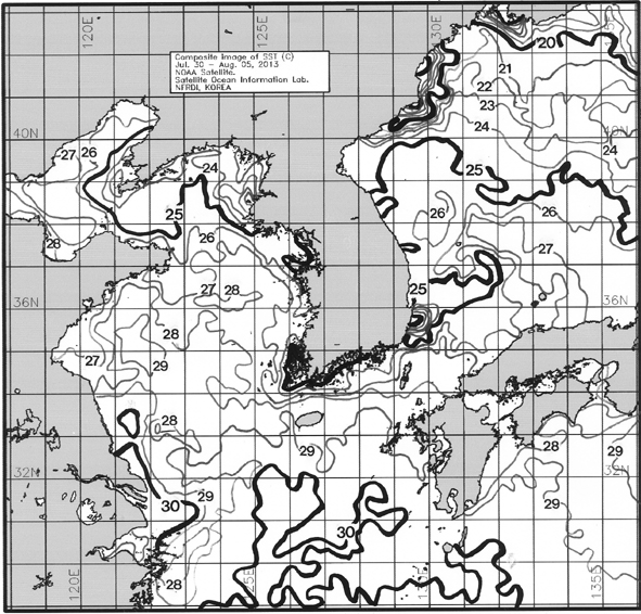 ◦ 금주(2013. 07. 30~2013. 08. 05)의 한국근해 표면수온은 대화퇴 근해 23~24도, 울릉도-독도 근해 26~27도, 대마도 근해 27~28도, 제주도 근해 28~29도, 이어도 근해 28~29도, 가거초 근해 27~28도, 어청도 근해 26~28도, 백령도 근해 24∼25도로 나타납니다. ◦「평년에 비해」대화퇴 근해 1.2도 낮게, 울릉도-독도 근해 0.5도 높게, 대마도 근해 비슷하게, 제주도 근해 1.3도 높게, 이어도 근해 0.7도 높게, 가거초 근해 1도 높게, 어청도 근해 1.2도 높게 나타납니다. ◦「전년에 비해」대화퇴 근해 2.5도 낮게, 울릉도-독도 근해 2.5도 낮게, 대마도 근해 1.5도 낮게, 제주도 근해 비슷하게, 이어도 근해 0.5도 높게, 가거초 근해 1도 낮게, 어청도 1.5도 낮게, 백령도 근해 0.5도 낮게 나타납니다. ◦ 수온 전선대는 우리나라 제주해협에서 대한해협까지 27도를 중심으로 형성됩니다. |