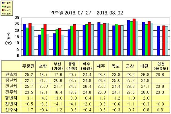 ◦ 금주(2013. 07. 27~2013. 08. 02)의 한반도 연안 표면수온은 동해 연안역에서 섭씨 16.5~25.5도, 남해 연안역 20.5~26.5도, 서해 연안역에서 23.5~28.5도로 나타납니다. ◦ 평년에 비해 주문진 3.1도 높음을 제외한 동해 연안역은 3∼5도 낮게, 제주 1.7도 높음을 제외한 남해 연안역은 0.5∼3.0도 낮게, 목포 1.2도 낮음을 제외한 서해 연안역은 1∼2도 높게 나타납니다. ◦ 전년에 비해 동해 연안역은 0.5~8.5도 낮게, 제주 0.8도 높음을 제외한 남해 연안역은 2.0∼4.5도 낮게, 대천, 인천(용유도)비슷함을 제외한 서해 연안역은 0.5~1.5도 낮게 나타납니다. |
