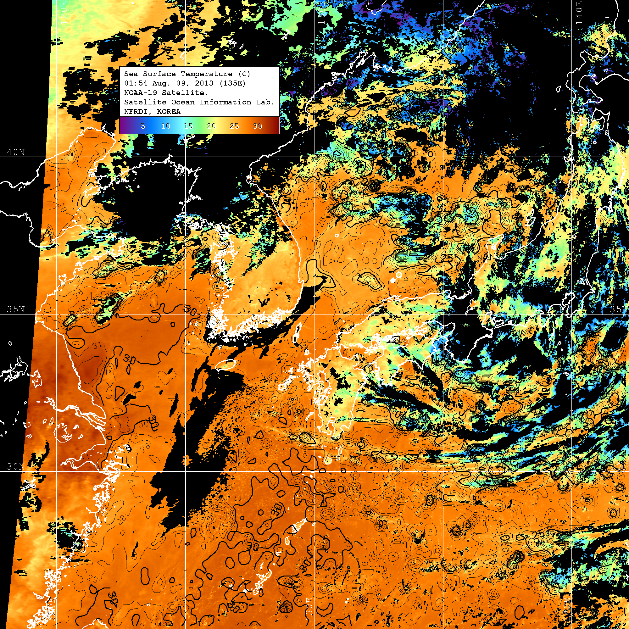 o 2013년 08월 09일 NOAA 위성영상입니다. o 영상 시간 및 수온분포는 범례를 참고하시기 바랍니다. o 검은색은 구름을 나타냅니다. o 그림을 클릭하시면 크게 보실 수 있습니다.