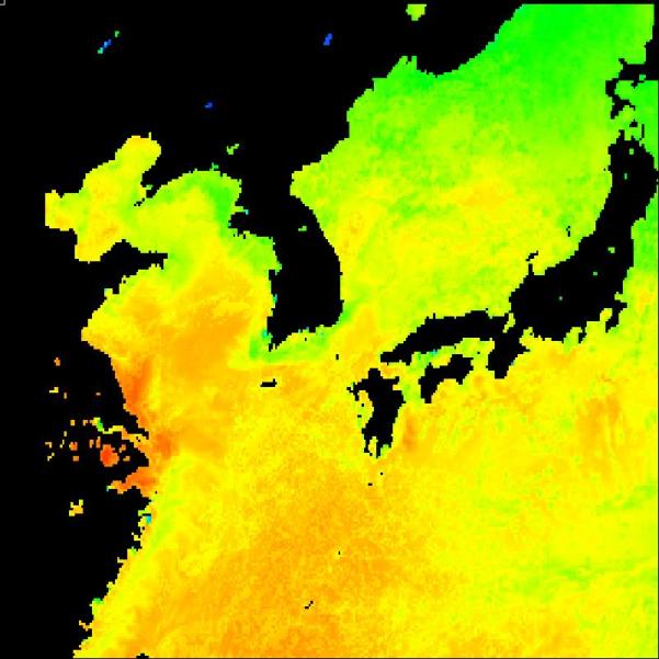 국립수산과학원 위성해양정보실에서 연구중인 2013년 08월 08일 구름이 배제된 수온 영상입니다.