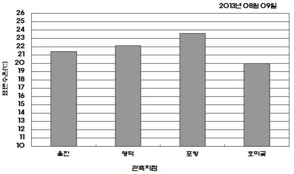 ◦ 2013년 08월 09일 17시를 기해 영덕연안 냉수대 주의보를 해제합니다. ◦ 2013년 08월 09일 오전 10시에 관측된 현장 표면수온은 울진 섭씨 21.4도, 영덕 22.1도, 포항 23.6도, 호미곶 20.0도의 수온을 나타내고 있습니다. ◦ 냉수대 소멸로 수온 급상승함에 따라 양식생물이 피해를 입을 수 있으니 주의하여 주시기 바랍니다.