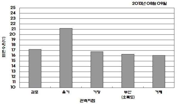 ◦ 아래 그림은 2013년 08월 09일 오전 10시에 관측된 현장 표면수온 분포입니다. ◦ 연안 관측 표면수온은 감포 17.2℃, 울기 21.2℃, 기장 16.8℃, 부산 16.3℃, 거제 16.1℃의 수온을 나타내고 있습니다.
