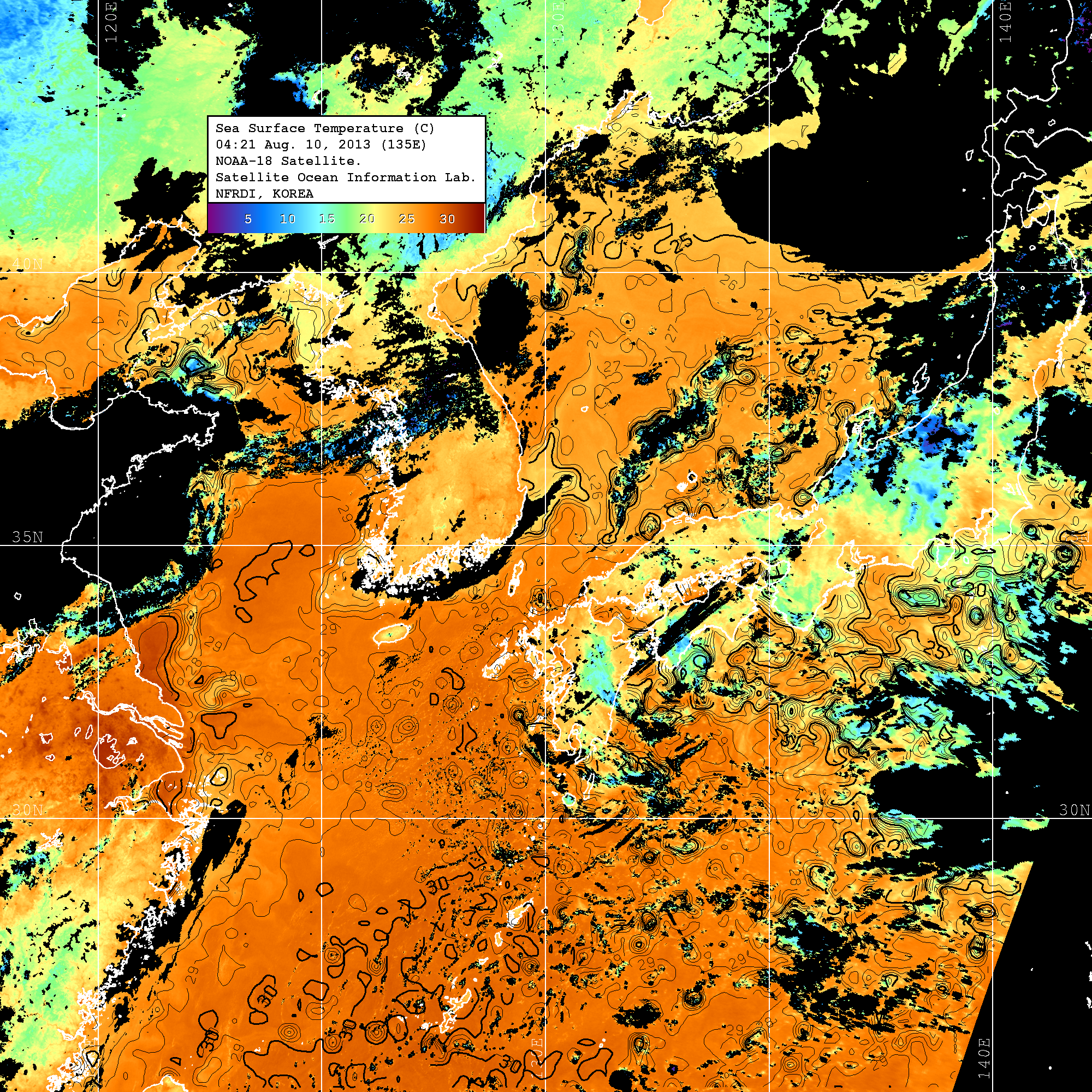 o 2013년 08월 10일 NOAA 위성영상입니다. o 영상 시간 및 수온분포는 범례를 참고하시기 바랍니다. o 검은색은 구름을 나타냅니다. o 그림을 클릭하시면 크게 보실 수 있습니다.