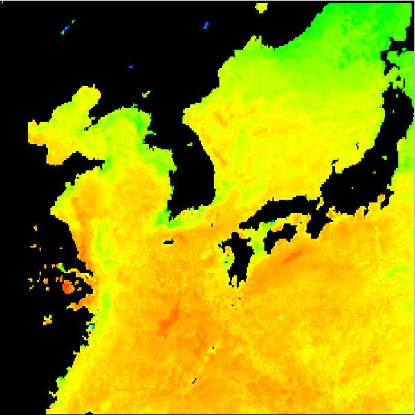 국립수산과학원 위성해양정보실에서 연구중인 2013년 08월 11일 구름이 배제된 수온 영상입니다.