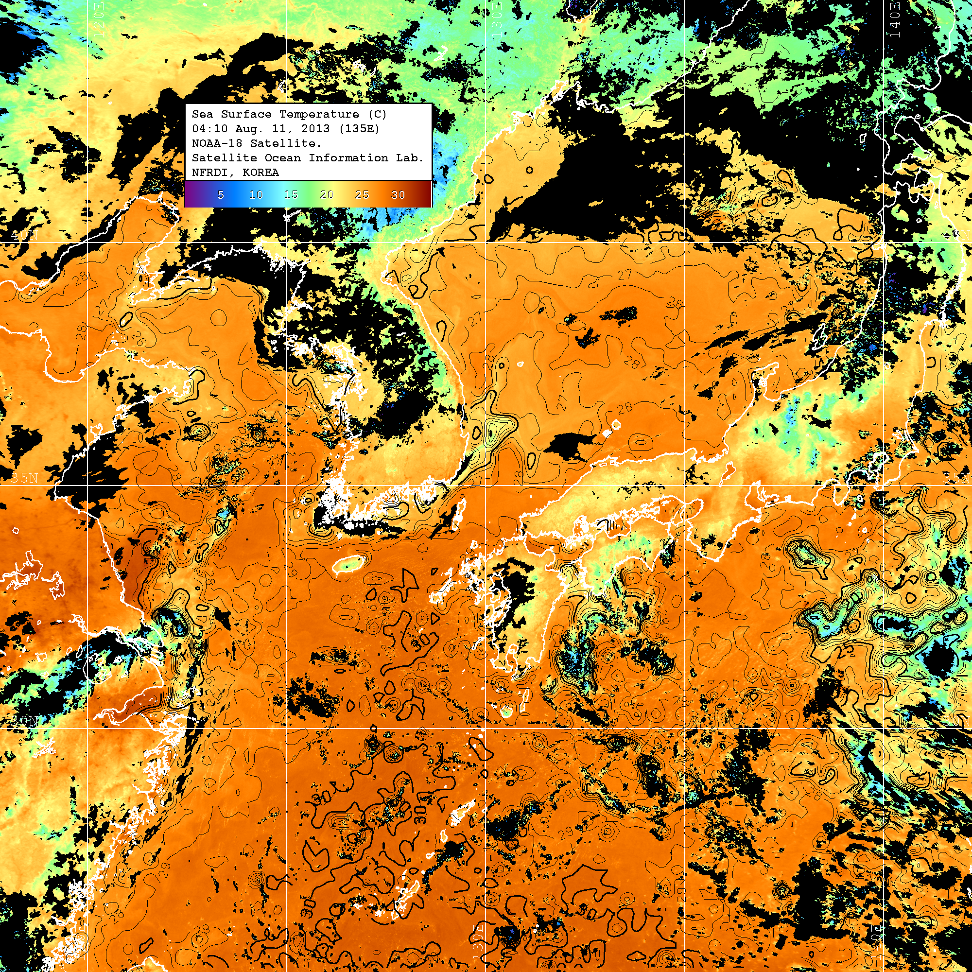 o 2013년 08월 11일 NOAA 위성영상입니다. o 영상 시간 및 수온분포는 범례를 참고하시기 바랍니다. o 검은색은 구름을 나타냅니다. o 그림을 클릭하시면 크게 보실 수 있습니다.