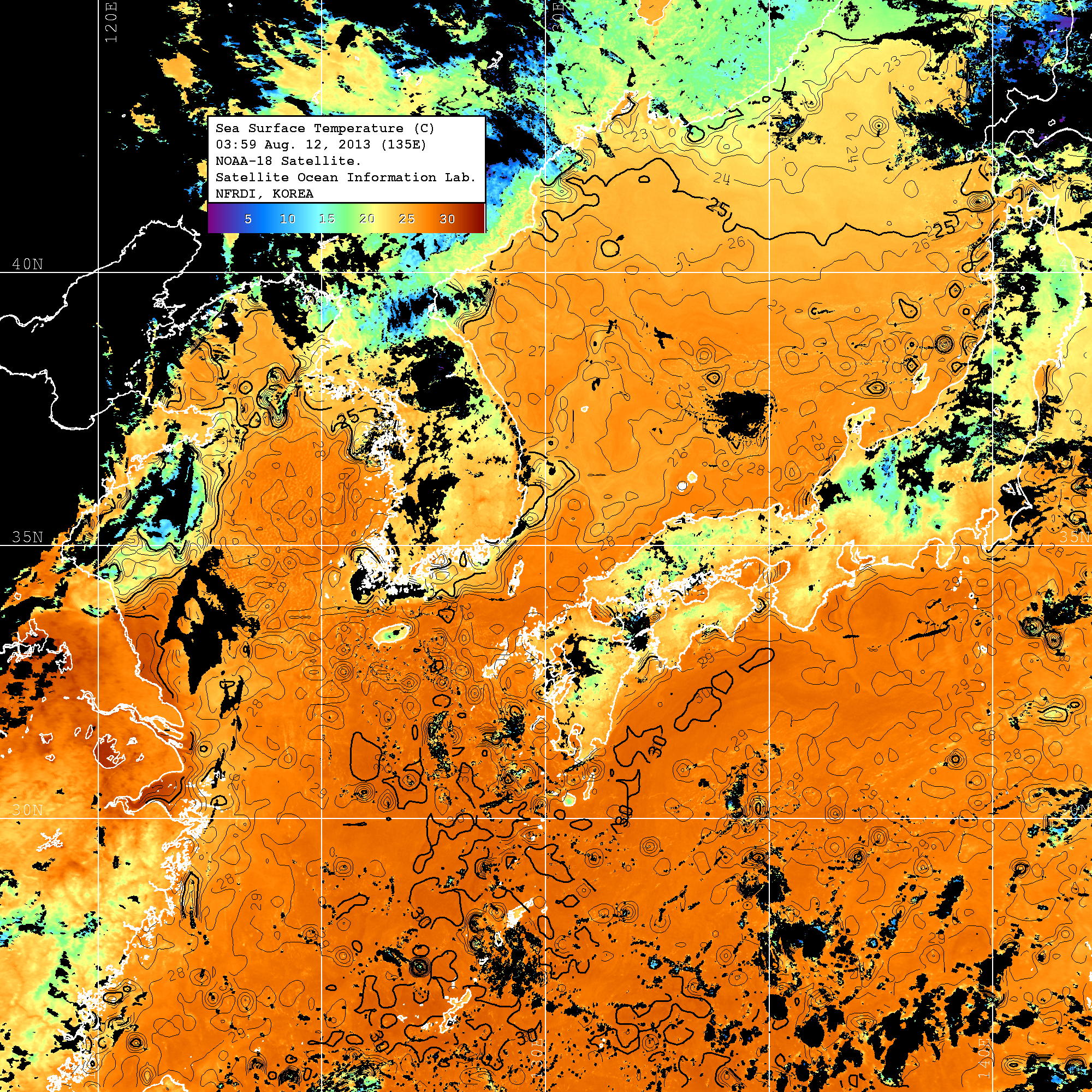 o 2013년 08월 12일 NOAA 위성영상입니다. o 영상 시간 및 수온분포는 범례를 참고하시기 바랍니다. o 검은색은 구름을 나타냅니다. o 그림을 클릭하시면 크게 보실 수 있습니다.