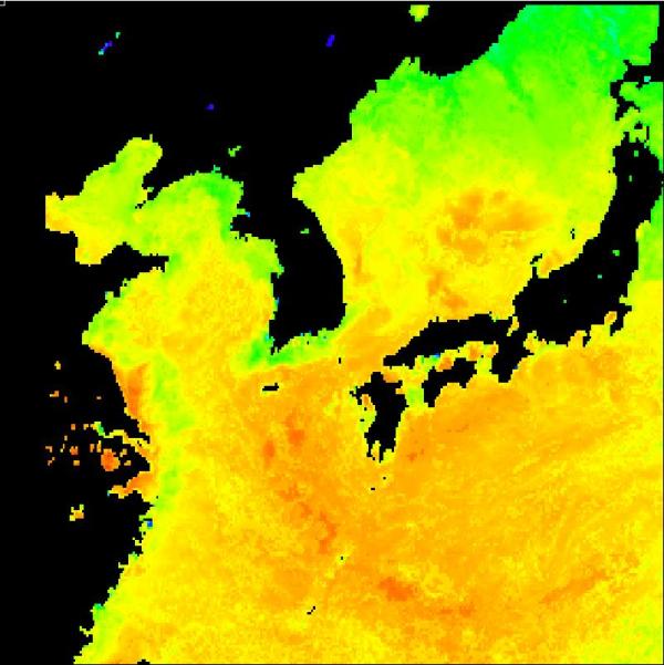 국립수산과학원 위성해양정보실에서 연구중인 2013년 08월 12일 구름이 배제된 수온 영상입니다.