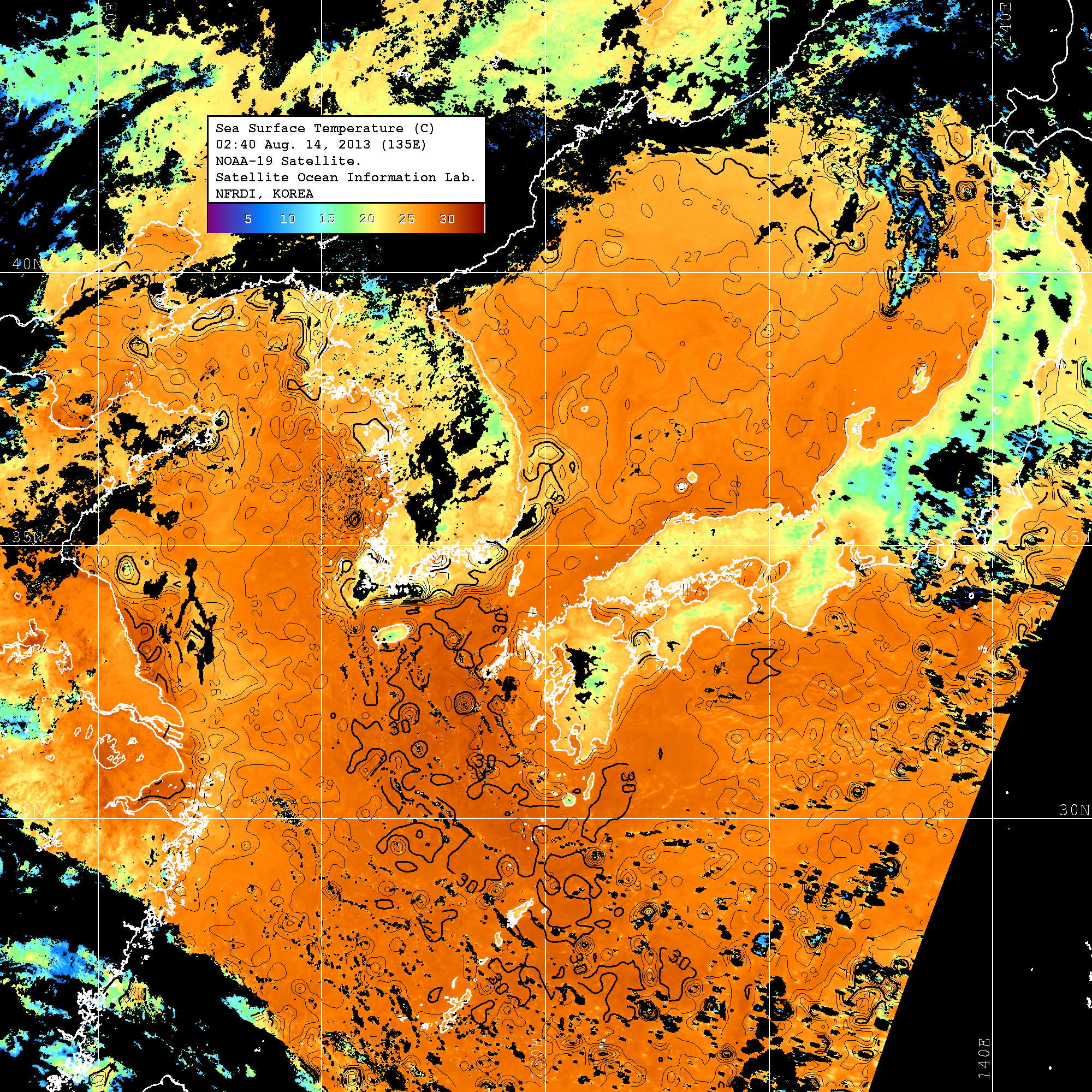 o 2013년 08월 14일 NOAA 위성영상입니다. o 영상 시간 및 수온분포는 범례를 참고하시기 바랍니다. o 검은색은 구름을 나타냅니다. o 그림을 클릭하시면 크게 보실 수 있습니다.