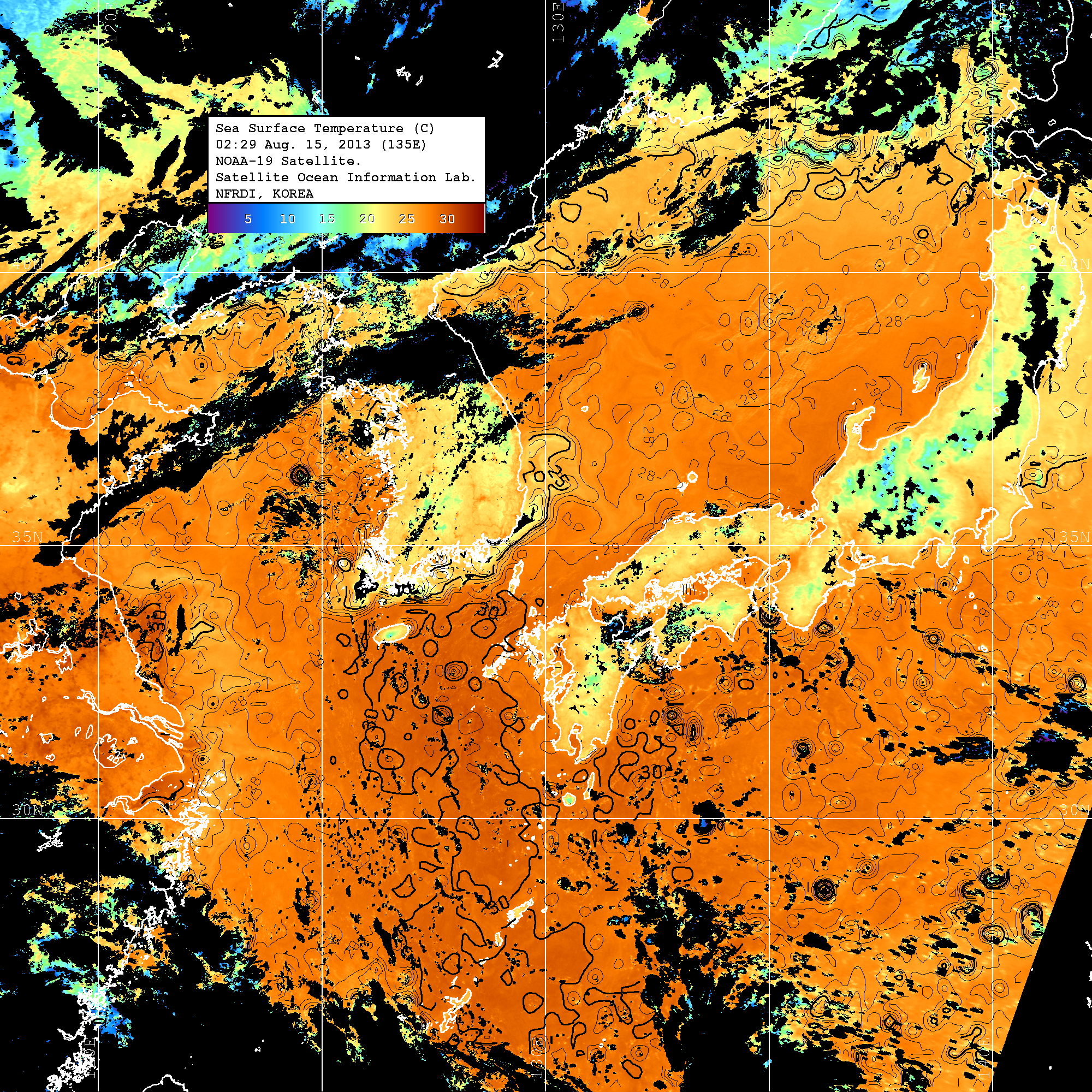o 2013년 08월 15일 NOAA 위성영상입니다. o 영상 시간 및 수온분포는 범례를 참고하시기 바랍니다. o 검은색은 구름을 나타냅니다. o 그림을 클릭하시면 크게 보실 수 있습니다.