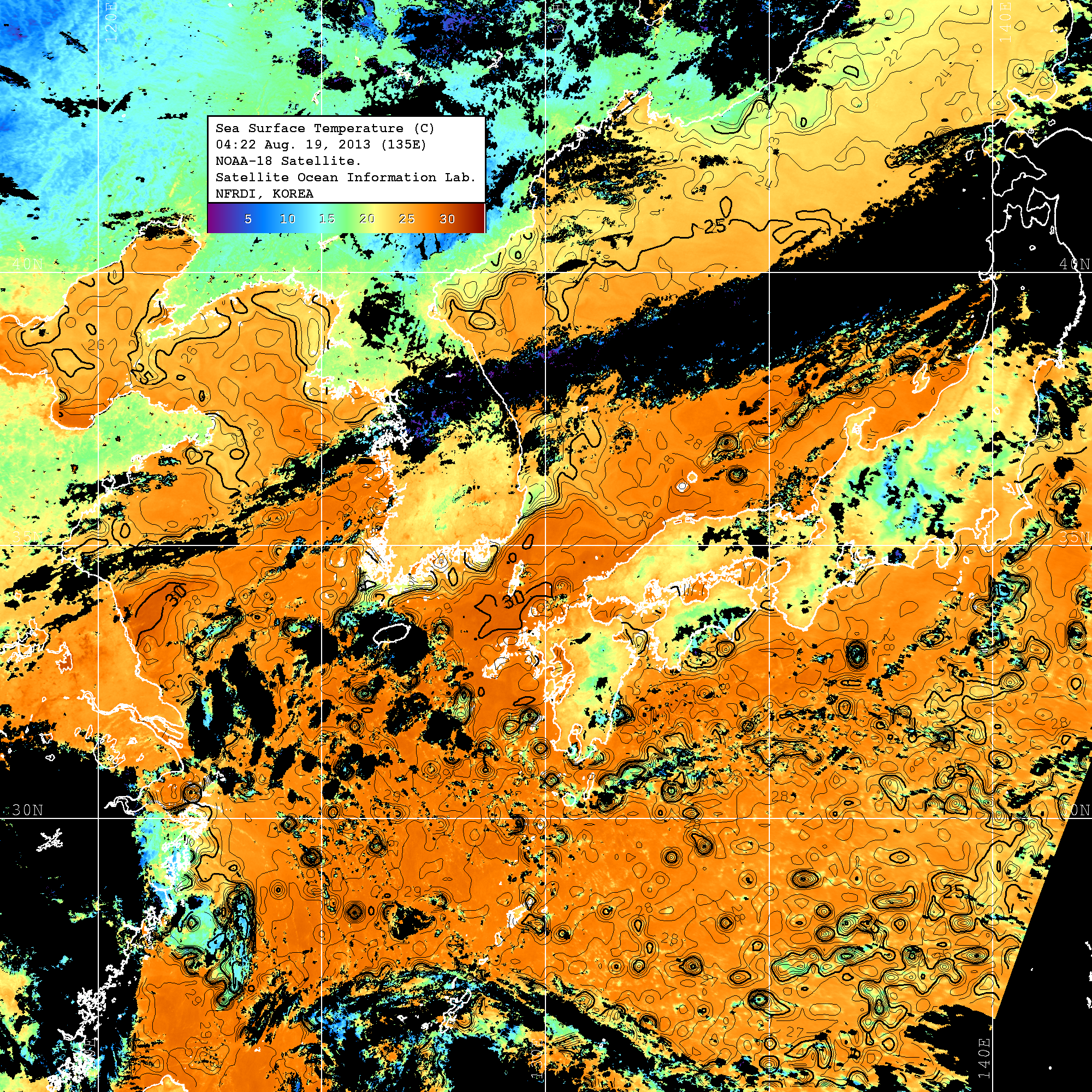 o 2013년 08월 19일 NOAA 위성영상입니다. o 영상 시간 및 수온분포는 범례를 참고하시기 바랍니다. o 검은색은 구름을 나타냅니다. o 그림을 클릭하시면 크게 보실 수 있습니다.