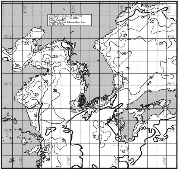 ◦ 금주(2013. 08. 13~2013. 08. 19)의 한국근해 표면수온은 대화퇴 근해 28~29도, 울릉도-독도 근해 28~29도, 대마도 근해 29~30도, 제주도 근해 29~30도, 이어도 근해 29~30도, 가거초 근해 28~29도, 어청도 근해 29~30도, 백령도 근해 26∼27도로 나타납니다. ◦「평년에 비해」대화퇴 근해 2.4도 높게, 울릉도-독도 근해 2.5도 높게, 대마도 근해 2.6도 높게, 제주도 근해 2.8도 높게, 이어도 근해 1.5도 높게, 가거초 근해 1.8도 높게, 어청도 근해 3.6도 높게 나타납니다. ◦「전년에 비해」대화퇴 근해 0.5도 높게, 울릉도-독도 근해 비슷하게, 대마도 근해 2도 높게, 제주도 근해 2도 높게, 이어도 근해 1도 높게, 가거초 근해 1도 높게, 어청도 4도 높게, 백령도 근해 2.5도 높게 나타납니다. ◦ 수온 전선대는 우리나라 제주해협에서 대한해협까지 29도를 중심으로 형성됩니다. |