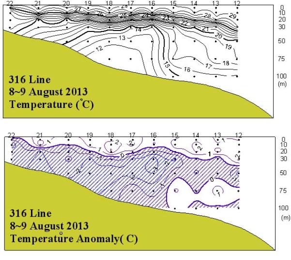 ◦ 2013년 8월 8~9일 국립수산과학원 수산해양종합정보과에서 조사한 동중국해 북부해역(316선)의 수온 수직분포도와 평년편차도입니다.