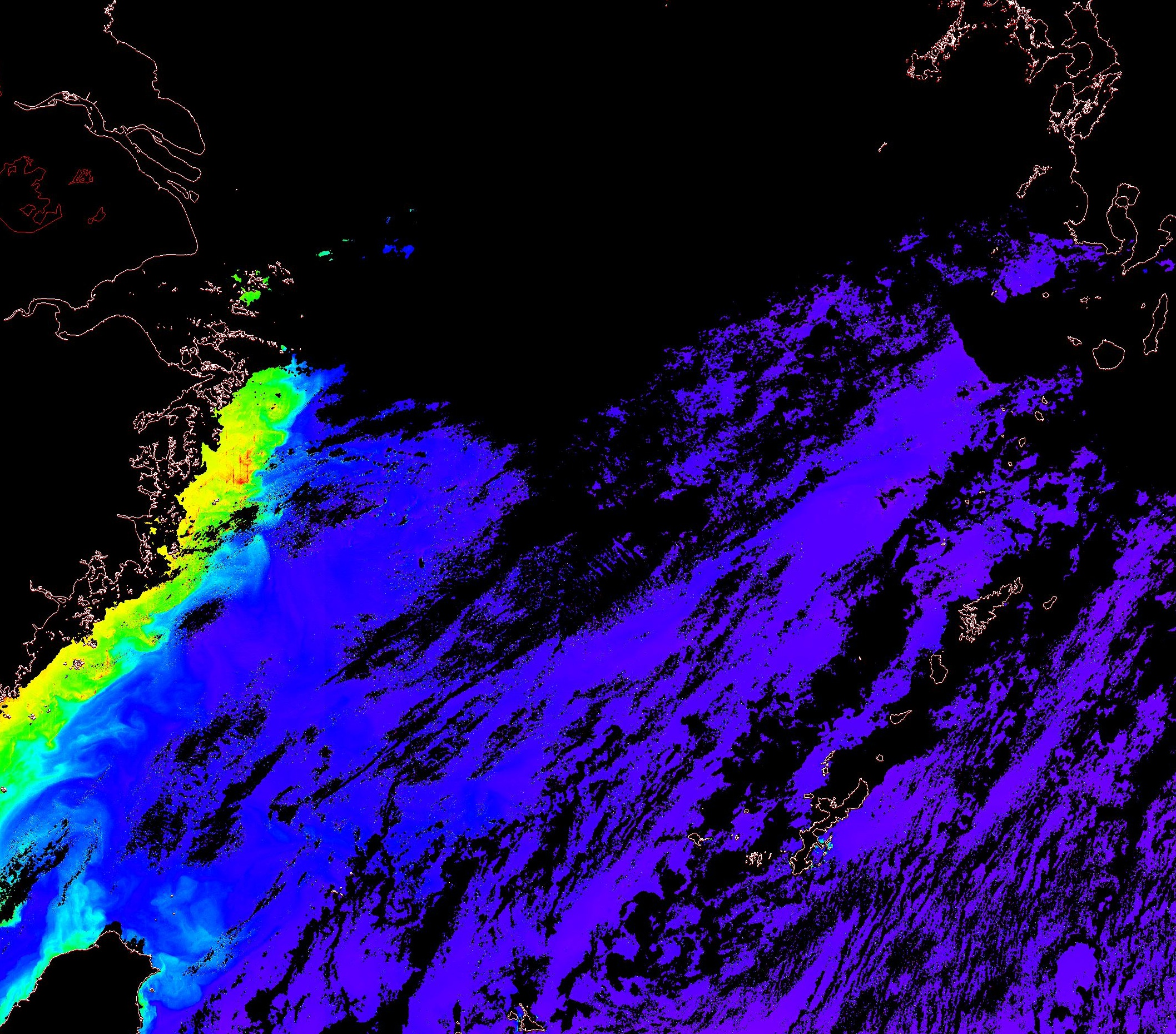 o 2013년 08월 25일 천리안 GOCI 위성영상입니다. [ GOCI : Geostationary Ocean Color Imager ] o 농도분포는 하단 범례를 참고하시기 바랍니다. o 검은색은 구름을 나타냅니다. o 그림을 클릭하시면 크게 보실 수 있습니다. o 천리안 GOCI 클로로필 a 동해지역. o 천리안 GOCI 클로로필 a 서해지역. o 천리안 GOCI 클로로필 a 남해지역. 천리안 GOCI 클로로필 a 둥중국해지역. o 천리안 GOCI 클로로필 a 대화퇴지역. ![]() 천리안 GOCI 영상은 한국해양과학기술원 해양위성센터에서 수신하였습니다. |