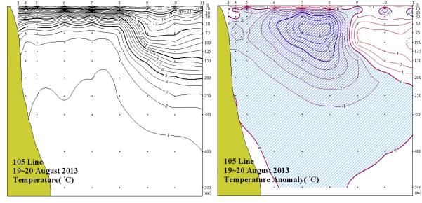 ◦ 2013년 08월 19~20일 국립수산과학원 동해수산연구소에서 조사한 105선(동해 동방)의 수직수온분포도 및 평년편차도입니다. ◦ 수온약층은 수심 10~50m 층에서 20℃를 중심으로 나타났습니다. ◦ 평년에 비하여 정점 9~11사이에서 표층부터 수심 200m까지 1~3℃의 고온 현상을 보인 반면 나머지 해역에서는 1~8℃의 저온현상을 나타내었습니다. =$row['content']?> =$row['content']?> =$row['content']?> |