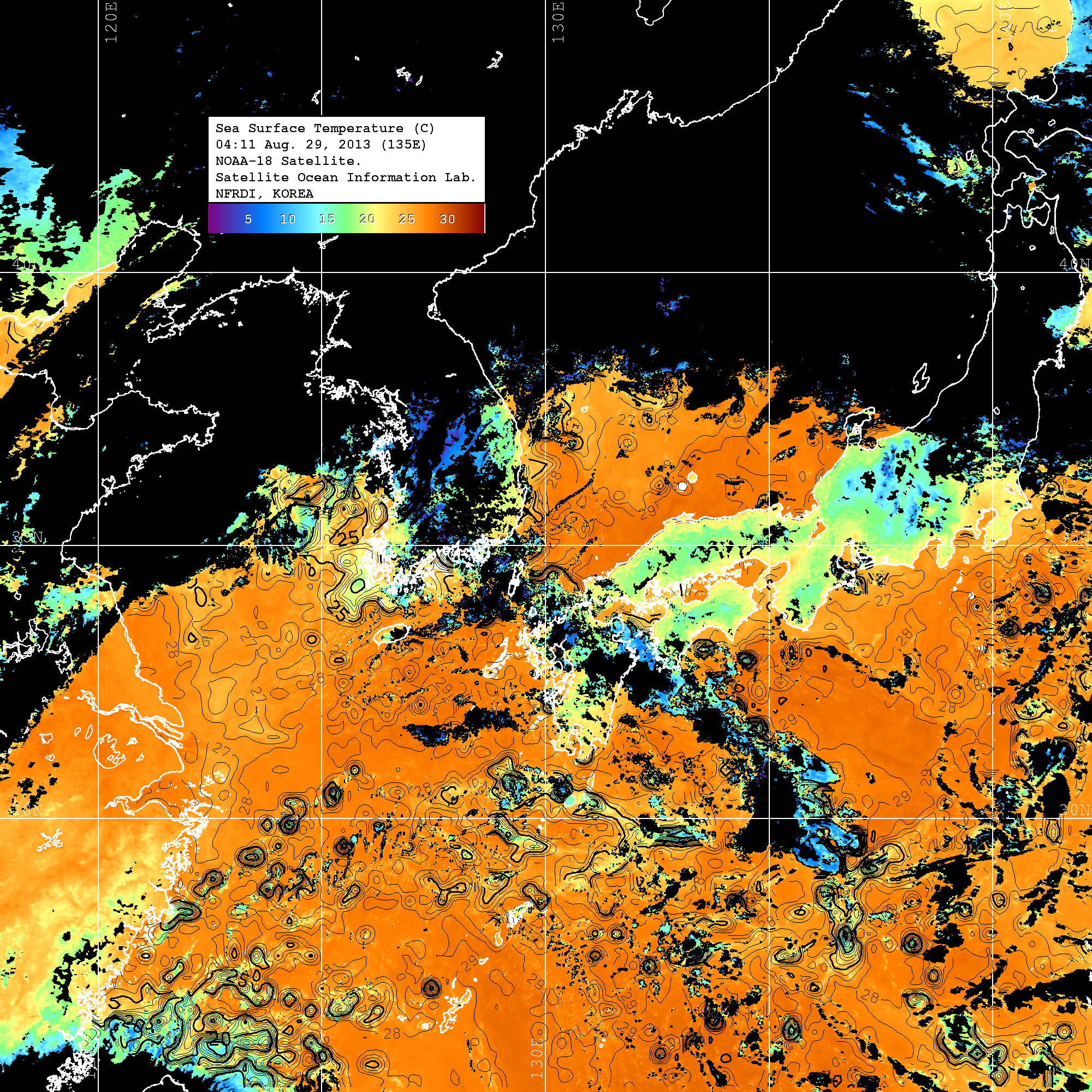 o 2013년 08월 29일 NOAA 위성영상입니다. o 영상 시간 및 수온분포는 범례를 참고하시기 바랍니다. o 검은색은 구름을 나타냅니다. o 그림을 클릭하시면 크게 보실 수 있습니다.