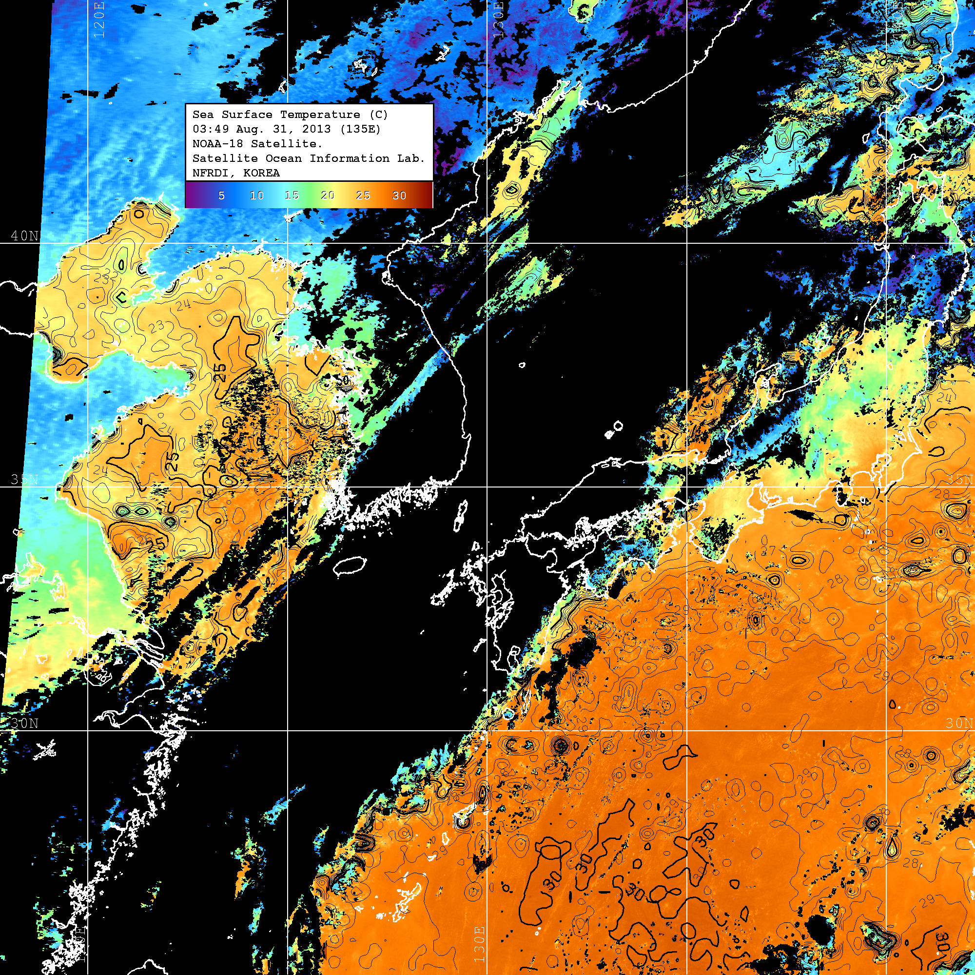 o 2013년 08월 31일 NOAA 위성영상입니다. o 영상 시간 및 수온분포는 범례를 참고하시기 바랍니다. o 검은색은 구름을 나타냅니다. o 그림을 클릭하시면 크게 보실 수 있습니다.