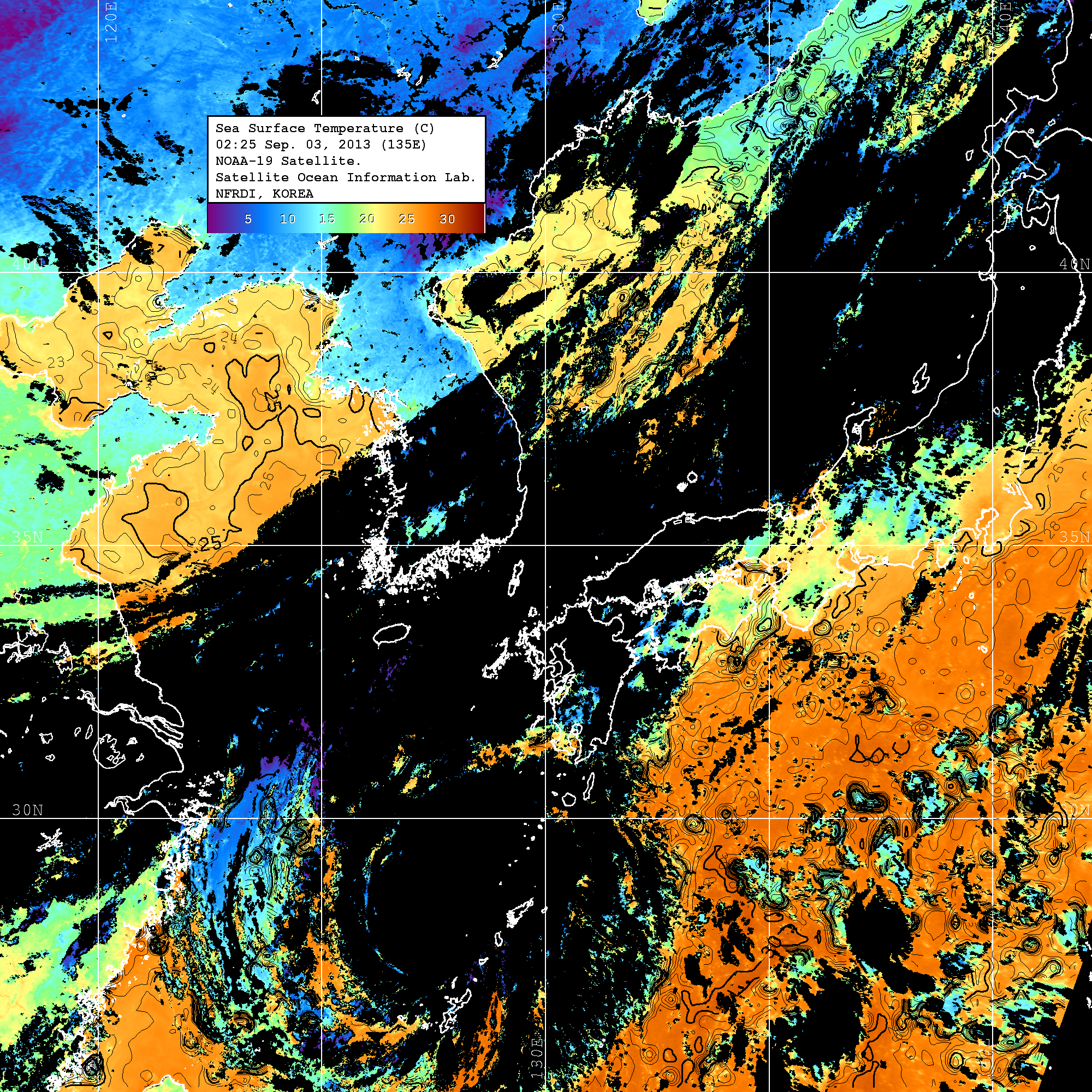 o 2013년 09월 03일 NOAA 위성영상입니다. o 영상 시간 및 수온분포는 범례를 참고하시기 바랍니다. o 검은색은 구름을 나타냅니다. o 그림을 클릭하시면 크게 보실 수 있습니다.