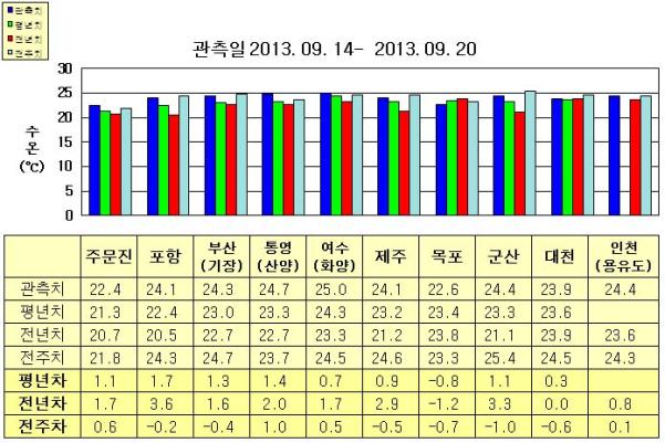 ◦ 금주(2013. 09. 14~2013. 09. 20)의 한반도 연안 표면수온은 동해 연안역에서 섭씨 22~25도, 남해 연안역 24~25도, 서해 연안역에서 22.5~24.5도로 나타납니다. ◦ 평년에 비해 동해 연안역은 1∼2도 높게, 남해 연안역은 0.5~1.5도 높게, 서해 연안역은 목포 0.8도 낮게, 군산 1.1도 높게, 대천 비슷하게 나타납니다. ◦ 전년에 비해 동해 연안역은 1.5~4.0도 높게, 남해 연안역은 1.5∼3.0도 높게, 목포 1.2도 낮게, 대천 비슷함을 제외한 서해 연안역은 0.5∼3.5도 낮게 나타납니다. |