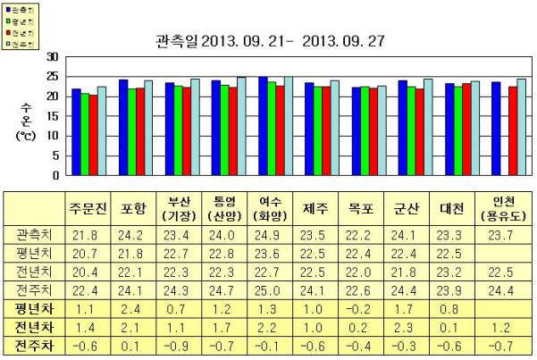 ◦ 금주(2013. 09. 21~2013. 09. 27)의 한반도 연안 표면수온은 동해 연안역에서 섭씨 21.5~24.5도, 남해 연안역 23.5~25.0도, 서해 연안역에서 22.0~24.5도로 나타납니다. ◦ 평년에 비해 동해 연안역은 0.5∼2.5도 높게, 남해 연안역은 1.0~1.5도 높게, 목포 비슷함을 제외한 서해 연안역은 0.5~2.0도 높게 나타납니다. ◦ 전년에 비해 동해 연안역은 1.0~2.5도 높게, 남해 연안역은 1.0∼2.5도 높게, 목포, 대천 비슷함을 제외한 서해 연안역은 1.0∼2.5도 높게 나타납니다. |