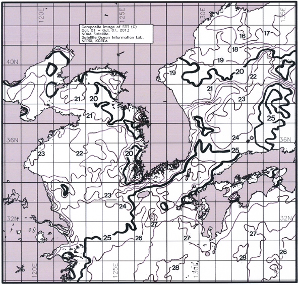 ◦ 금주(2013. 10. 01~2013. 10. 07)의 한국근해 표면수온은 대화퇴 근해 19~21도, 울릉도-독도 근해 22~23도, 대마도 근해 25~26도, 제주도 근해 25~26도, 이어도 근해 24~25도, 가거초 근해 22~23도, 어청도 근해 20~22도, 백령도 근해 18∼20도로 나타납니다. ◦「평년에 비해」대화퇴 근해 비슷하게, 울릉도-독도 근해 1.3도 높게, 대마도 근해 1.6도 높게, 제주도 근해 1.9도 높게, 이어도 근해 0.5도 높게, 가거초 근해 0.8도 높게, 어청도 근해 0.7도 높게 나타납니다. ◦「전년에 비해」대화퇴 근해 3.5도 낮게, 울릉도-독도 근해 0.5도 높게, 대마도 근해 2도 높게, 제주도 근해 2도 높게, 이어도 근해 1.5도 높게, 가거초 근해 0.5도 높게, 어청도 0.5도 낮게, 백령도 근해 0.5도 낮게 나타납니다. ◦ 수온 전선대는 우리나라 제주해협에서 대한해협까지 24도를 중심으로 형성됩니다. |