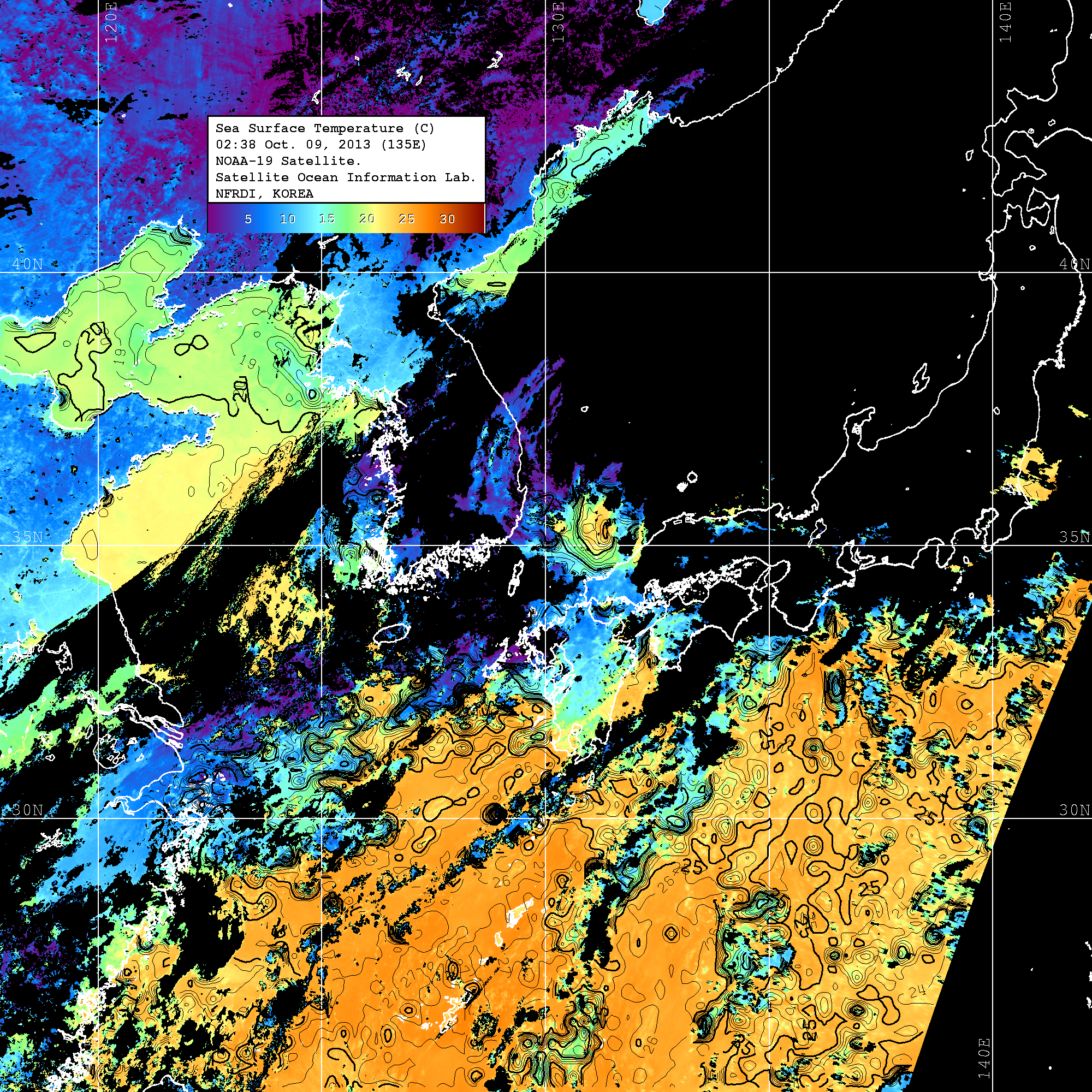 o 2013년 10월 09일 NOAA 위성영상입니다. o 영상 시간 및 수온분포는 범례를 참고하시기 바랍니다. o 검은색은 구름을 나타냅니다. o 그림을 클릭하시면 크게 보실 수 있습니다.