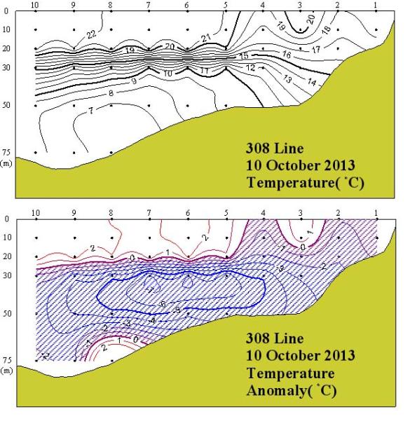 ◦ 2013년 10월 10일 국립수산과학원 서해수산연구소에서 조사한 308선 (대천 서방)의 수직수온분포도 및 평년편차도입니다. ◦ 수온약층은 15℃를 중심으로 20∼50m 부근에서 형성되었으며 연안으로 갈수록 약하게 형성되었습니다. 그 이하 수심에서 1∼7℃의 저온현상을 보였습니다. =$row['content']?> =$row['content']?> =$row['content']?> |