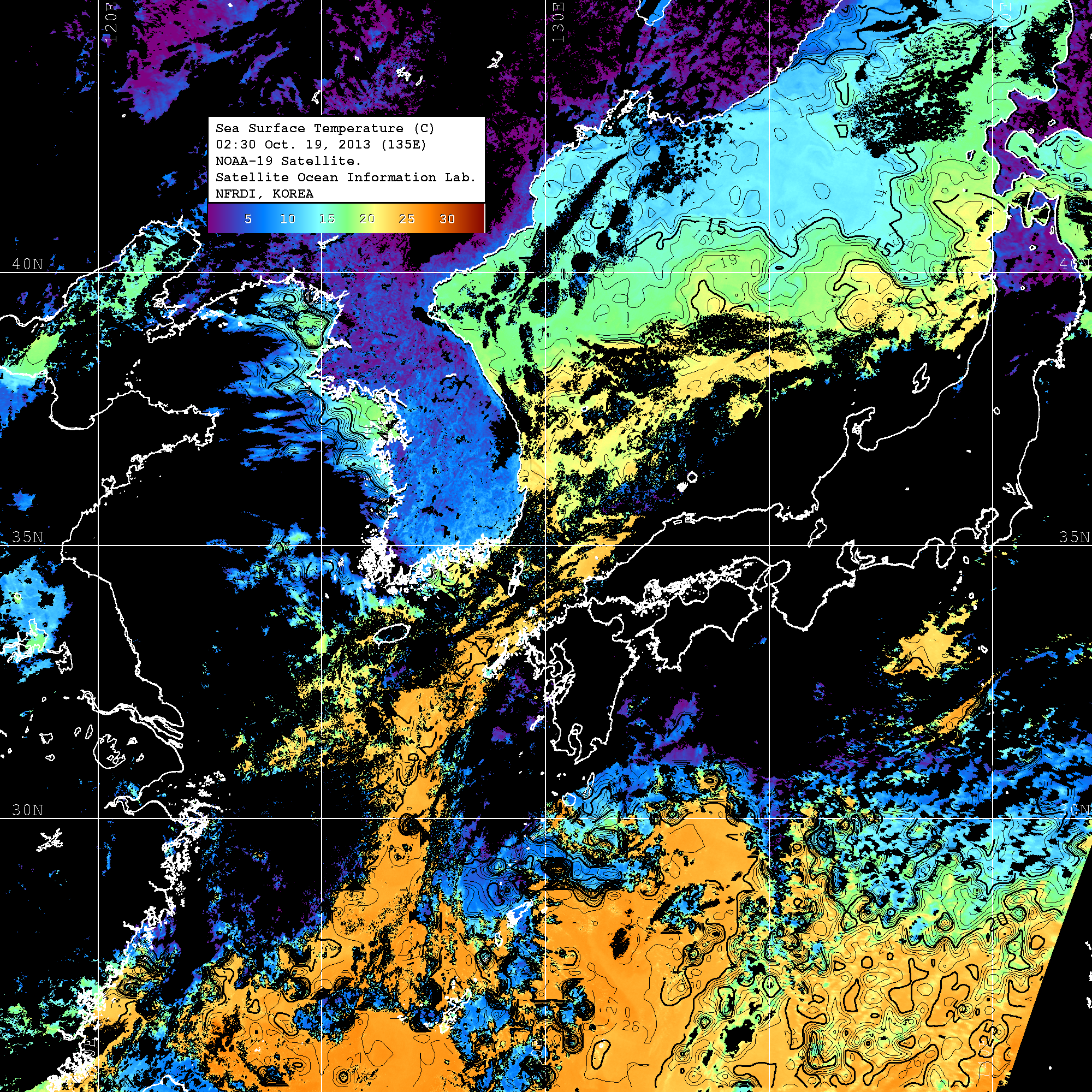 o 2013년 10월 19일 NOAA 위성영상입니다. o 영상 시간 및 수온분포는 범례를 참고하시기 바랍니다. o 검은색은 구름을 나타냅니다. o 그림을 클릭하시면 크게 보실 수 있습니다.