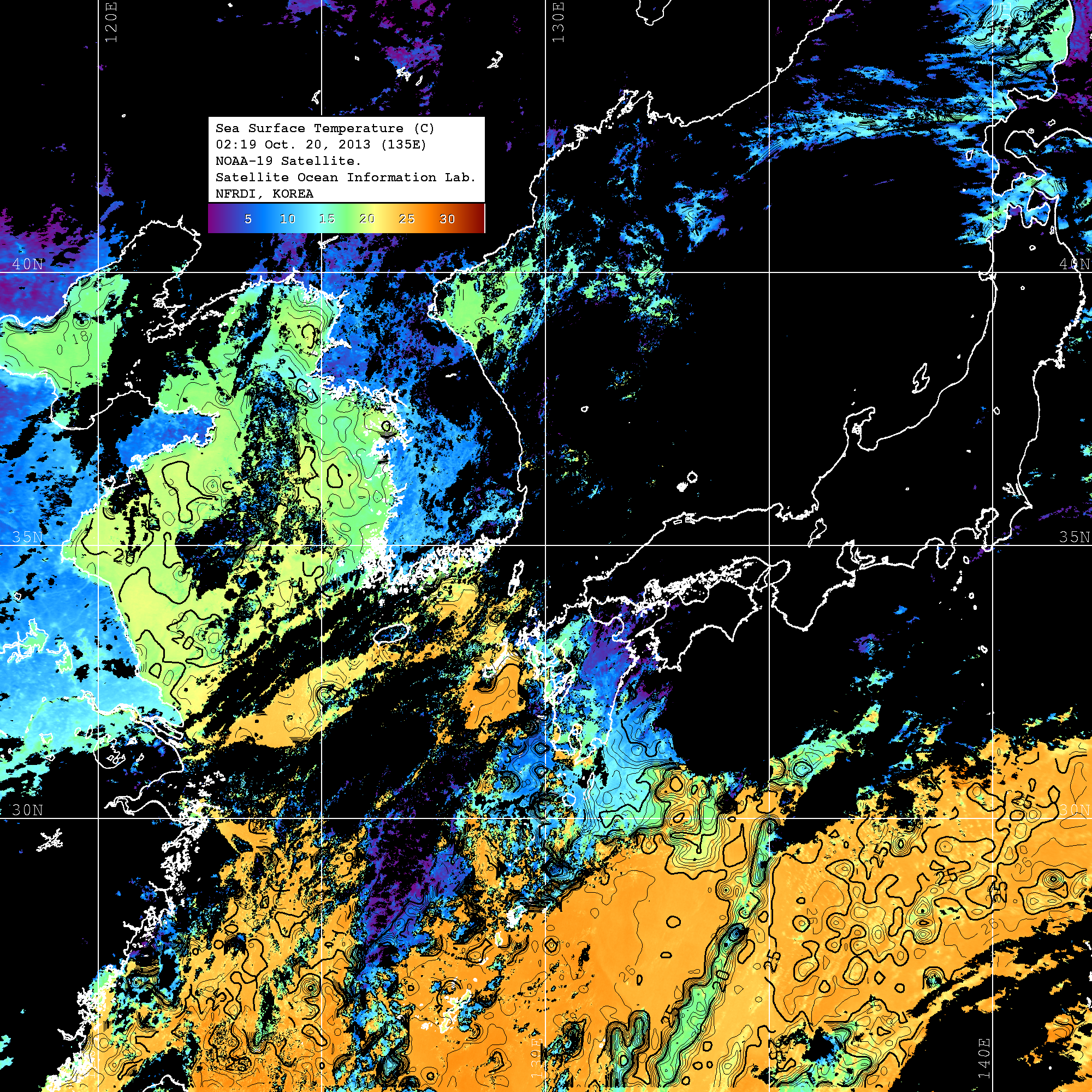 o 2013년 10월 20일 NOAA 위성영상입니다. o 영상 시간 및 수온분포는 범례를 참고하시기 바랍니다. o 검은색은 구름을 나타냅니다. o 그림을 클릭하시면 크게 보실 수 있습니다.