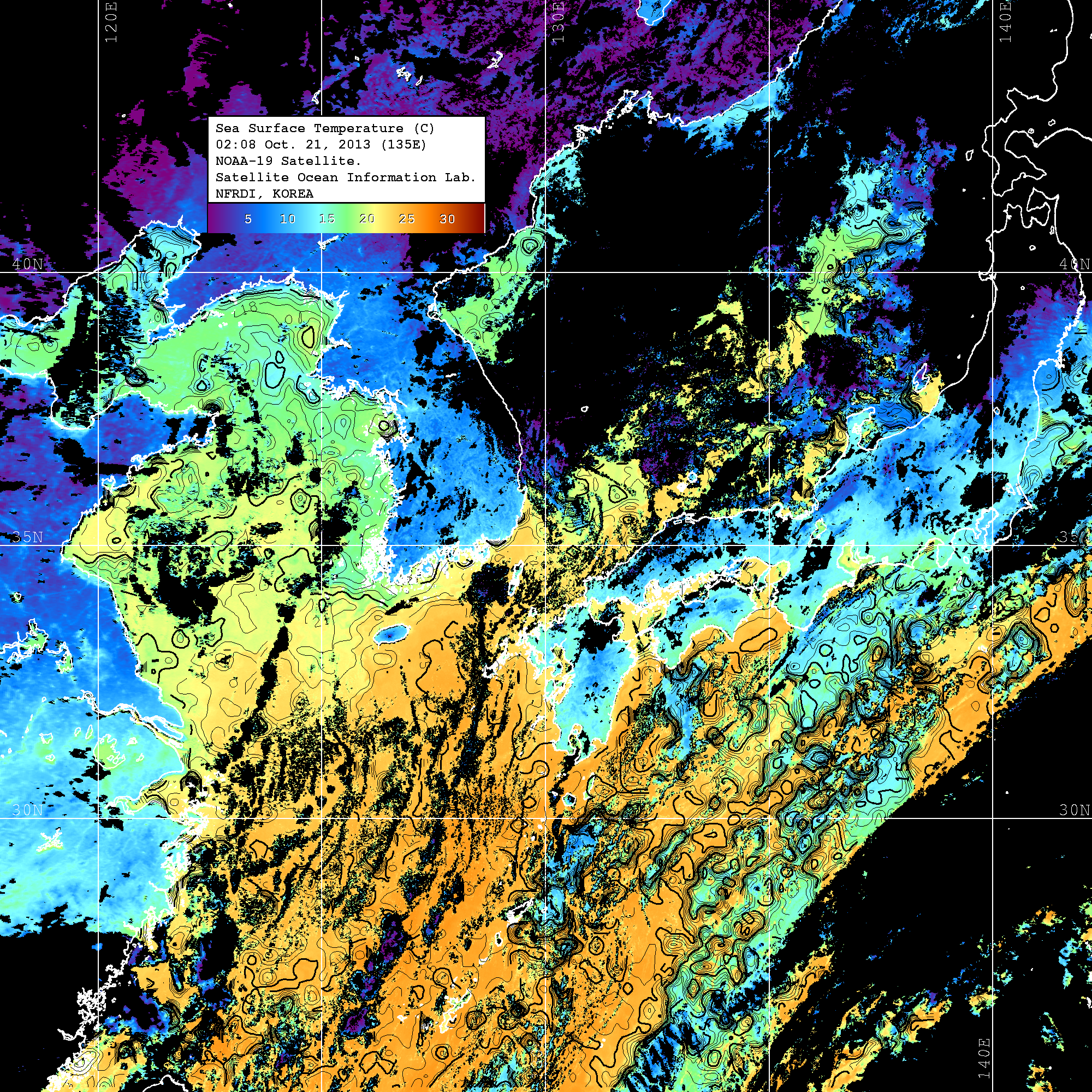o 2013년 10월 21일 NOAA 위성영상입니다. o 영상 시간 및 수온분포는 범례를 참고하시기 바랍니다. o 검은색은 구름을 나타냅니다. o 그림을 클릭하시면 크게 보실 수 있습니다.
