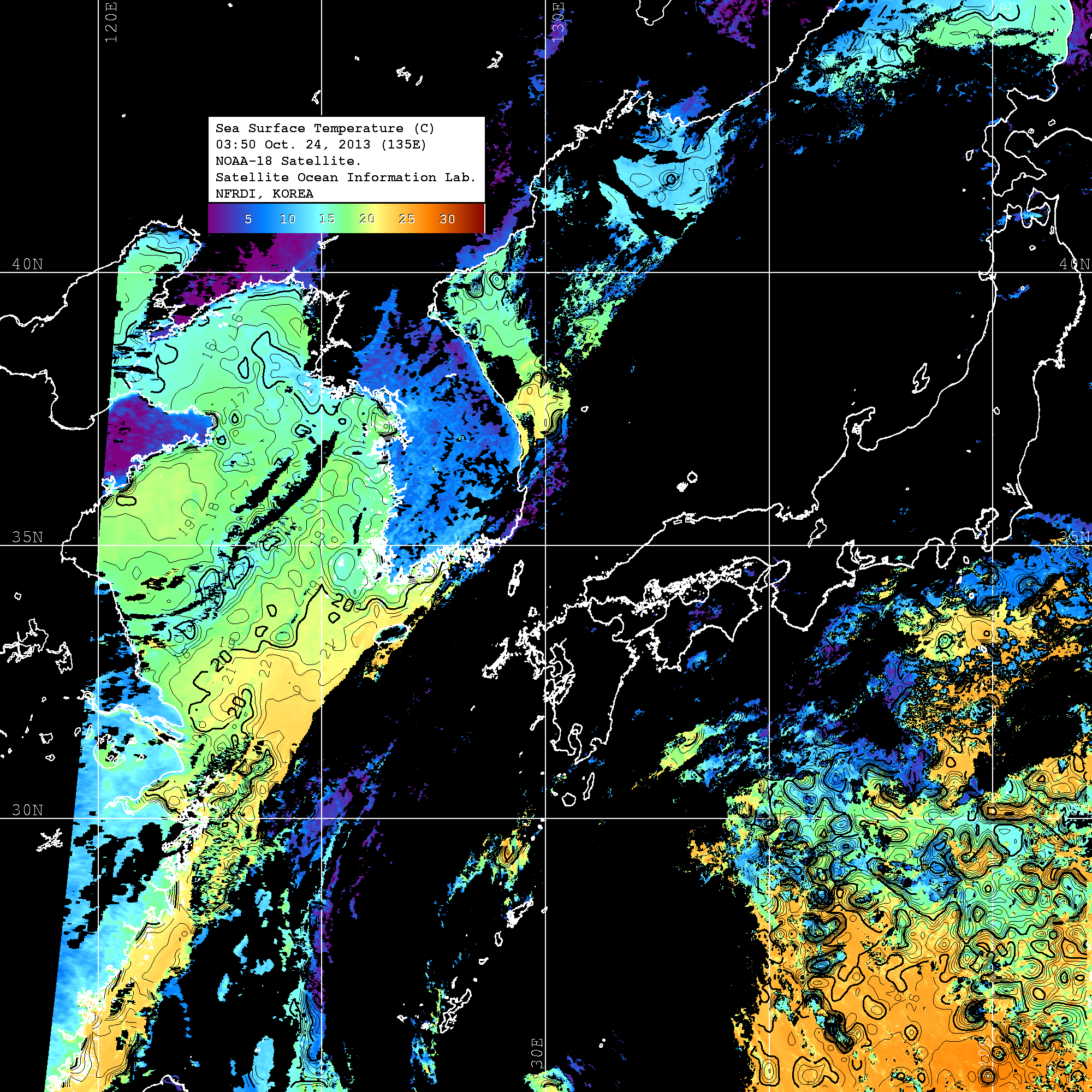 o 2013년 10월 24일 NOAA 위성영상입니다. o 영상 시간 및 수온분포는 범례를 참고하시기 바랍니다. o 검은색은 구름을 나타냅니다. o 그림을 클릭하시면 크게 보실 수 있습니다.