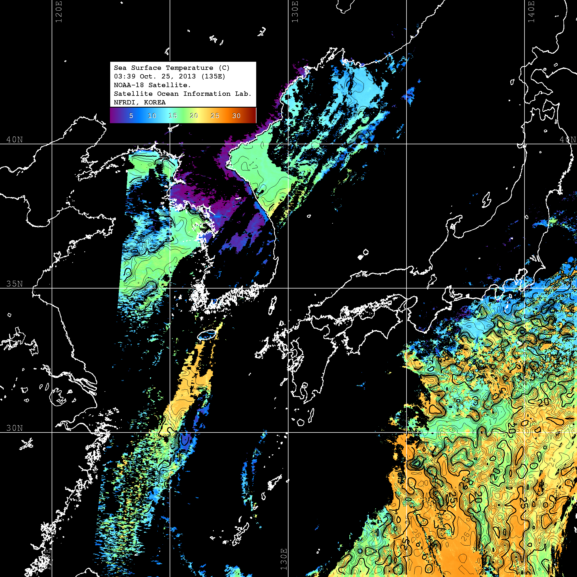 o 2013년 10월 25일 NOAA 위성영상입니다. o 영상 시간 및 수온분포는 범례를 참고하시기 바랍니다. o 검은색은 구름을 나타냅니다. o 그림을 클릭하시면 크게 보실 수 있습니다.