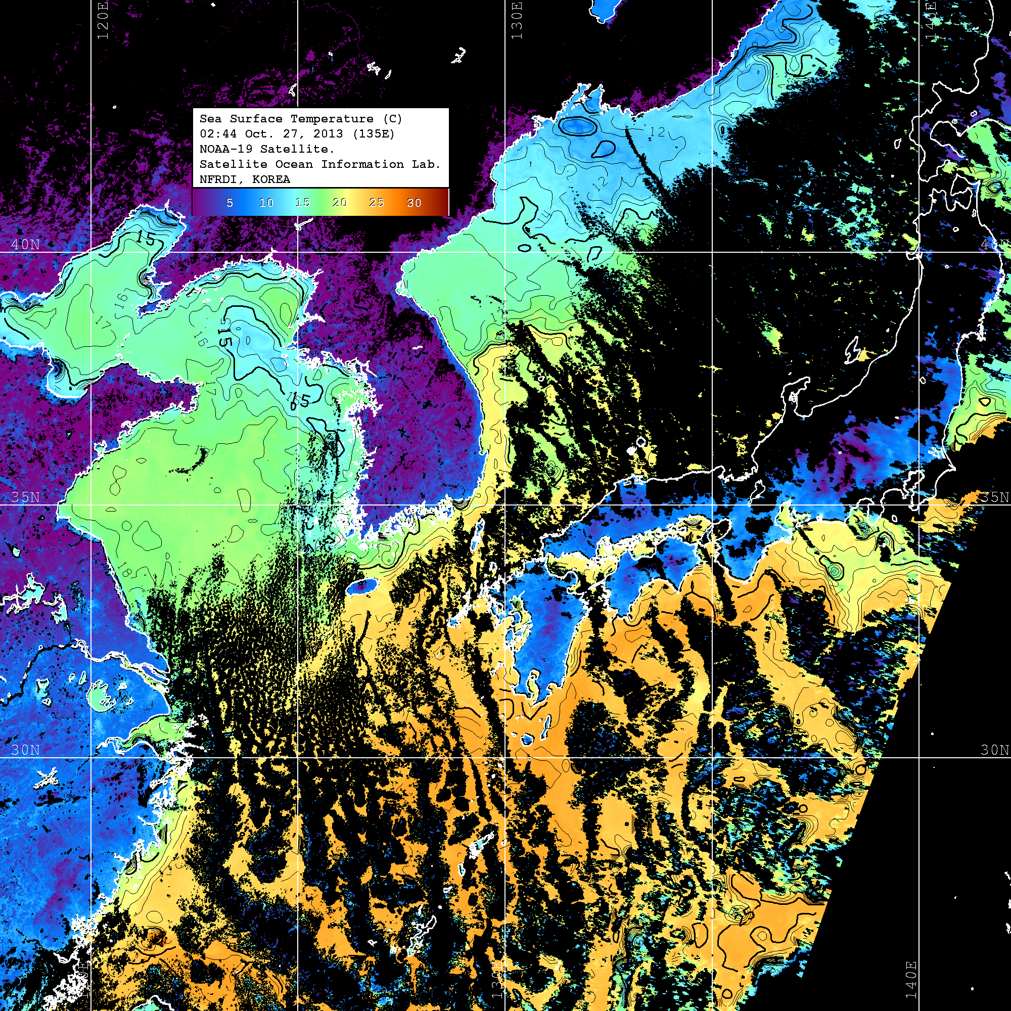 o 2013년 10월 27일 NOAA 위성영상입니다. o 영상 시간 및 수온분포는 범례를 참고하시기 바랍니다. o 검은색은 구름을 나타냅니다. o 그림을 클릭하시면 크게 보실 수 있습니다.