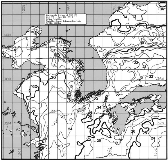◦ 금주(2013. 10. 22~2013. 10. 28)의 한국근해 표면수온은 대화퇴 근해 16~18도, 울릉도-독도 근해 20~21도, 대마도 근해 22~24도, 제주도 근해 23~24도, 이어도 근해 23~24도, 가거초 근해 21~22도, 어청도 근해 17~18도, 백령도 근해 15∼17도로 나타납니다. ◦「평년에 비해」대화퇴 근해 0.6도 낮게, 울릉도-독도 근해 1.2도 높게, 대마도 근해 0.5도 높게, 제주도 근해 1.8도 높게, 이어도 근해 1.5도 높게, 가거초 근해 2.5도 높게, 어청도 근해 0.5도 높게 나타납니다. ◦「전년에 비해」대화퇴 근해 0.5도 낮게, 울릉도-독도 근해 0.5도 낮게, 대마도 근해 비슷하게, 제주도 근해 0.5도 높게, 이어도 근해 1도 높게, 가거초 근해 2도 높게, 어청도 0.5도 높게, 백령도 근해 0.5도 낮게 나타납니다. ◦ 수온 전선대는 우리나라 제주해협에서 대한해협까지 23도를 중심으로 형성됩니다. |