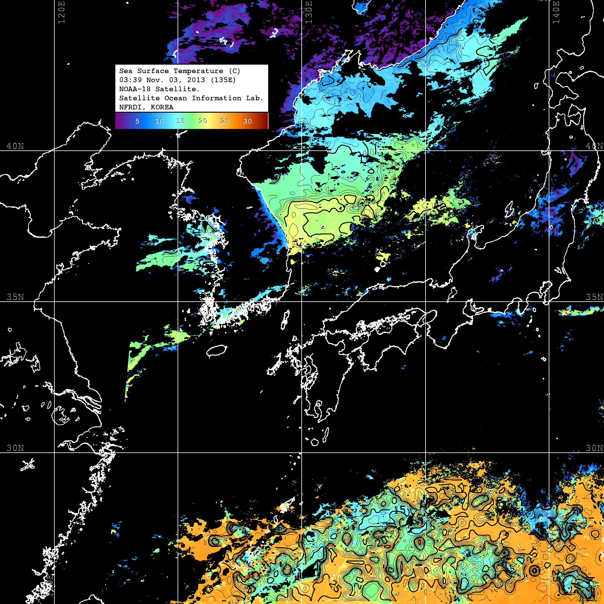 o 2013년 11월 03일 NOAA 위성영상입니다. o 영상 시간 및 수온분포는 범례를 참고하시기 바랍니다. o 검은색은 구름을 나타냅니다. o 그림을 클릭하시면 크게 보실 수 있습니다.