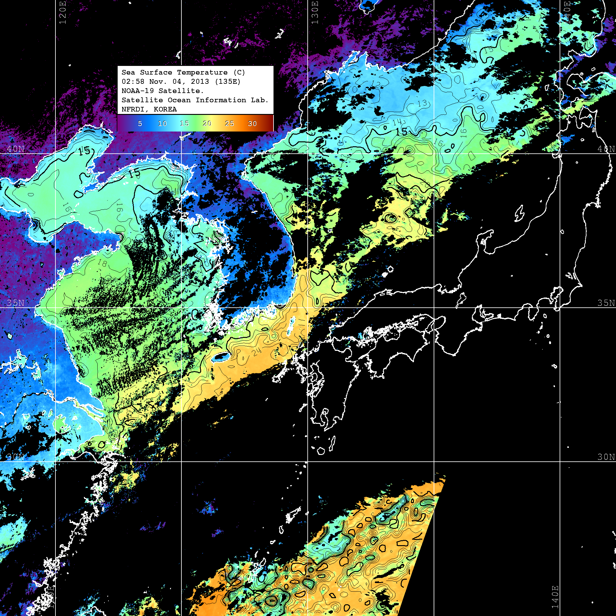 o 2013년 11월 04일 NOAA 위성영상입니다. o 영상 시간 및 수온분포는 범례를 참고하시기 바랍니다. o 검은색은 구름을 나타냅니다. o 그림을 클릭하시면 크게 보실 수 있습니다.