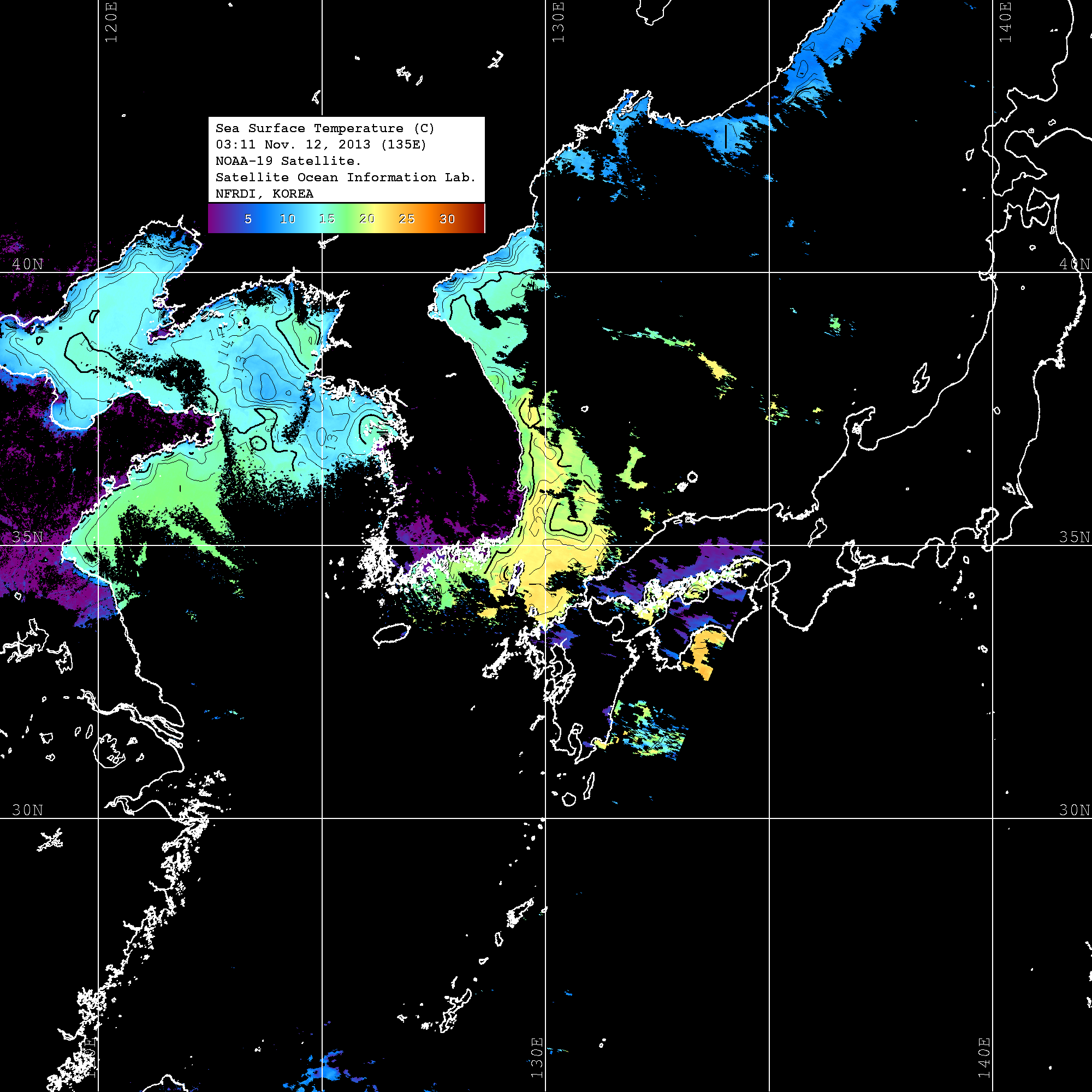 o 2013년 11월 12일 NOAA 위성영상입니다. o 영상 시간 및 수온분포는 범례를 참고하시기 바랍니다. o 검은색은 구름을 나타냅니다. o 그림을 클릭하시면 크게 보실 수 있습니다.