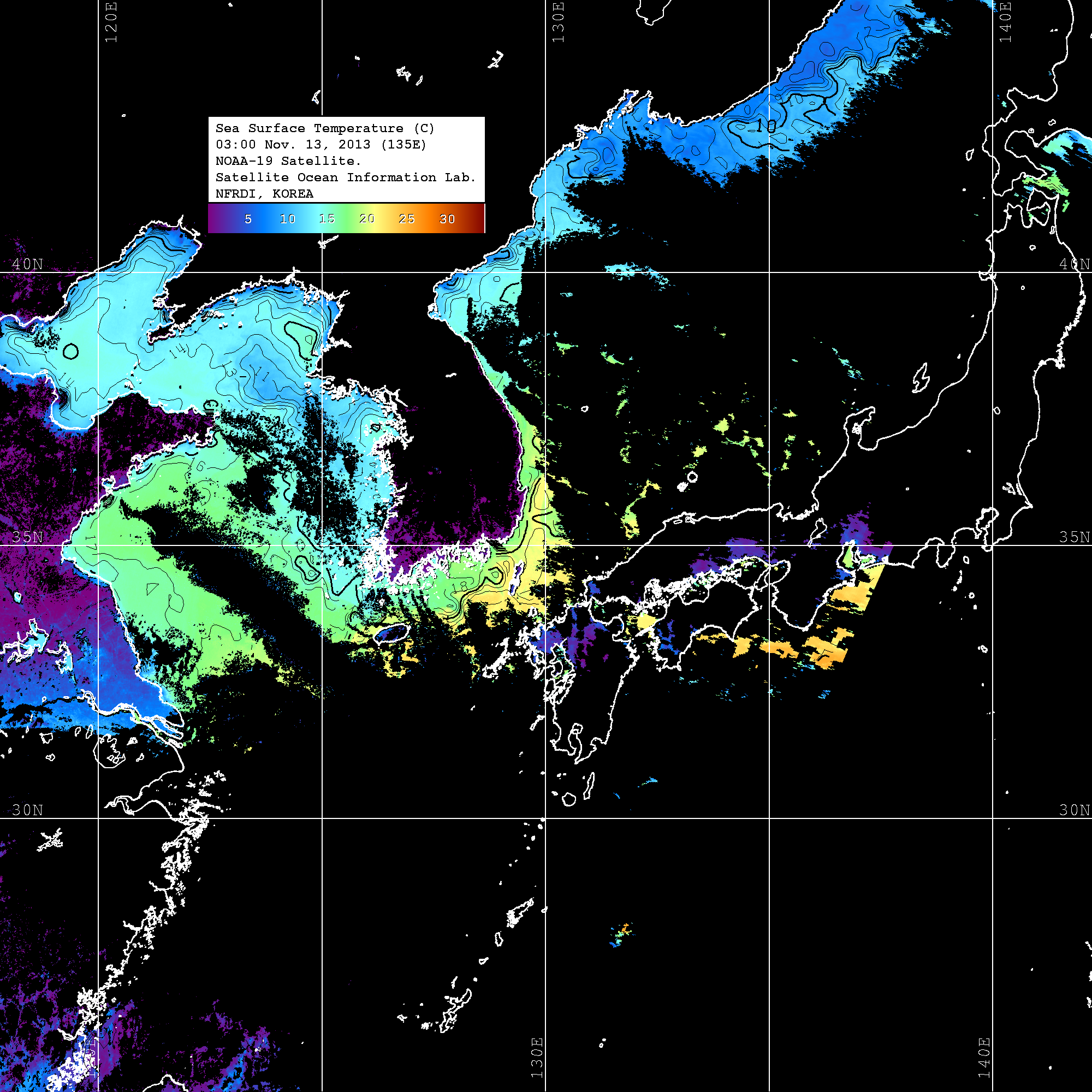 o 2013년 11월 13일 NOAA 위성영상입니다. o 영상 시간 및 수온분포는 범례를 참고하시기 바랍니다. o 검은색은 구름을 나타냅니다. o 그림을 클릭하시면 크게 보실 수 있습니다.