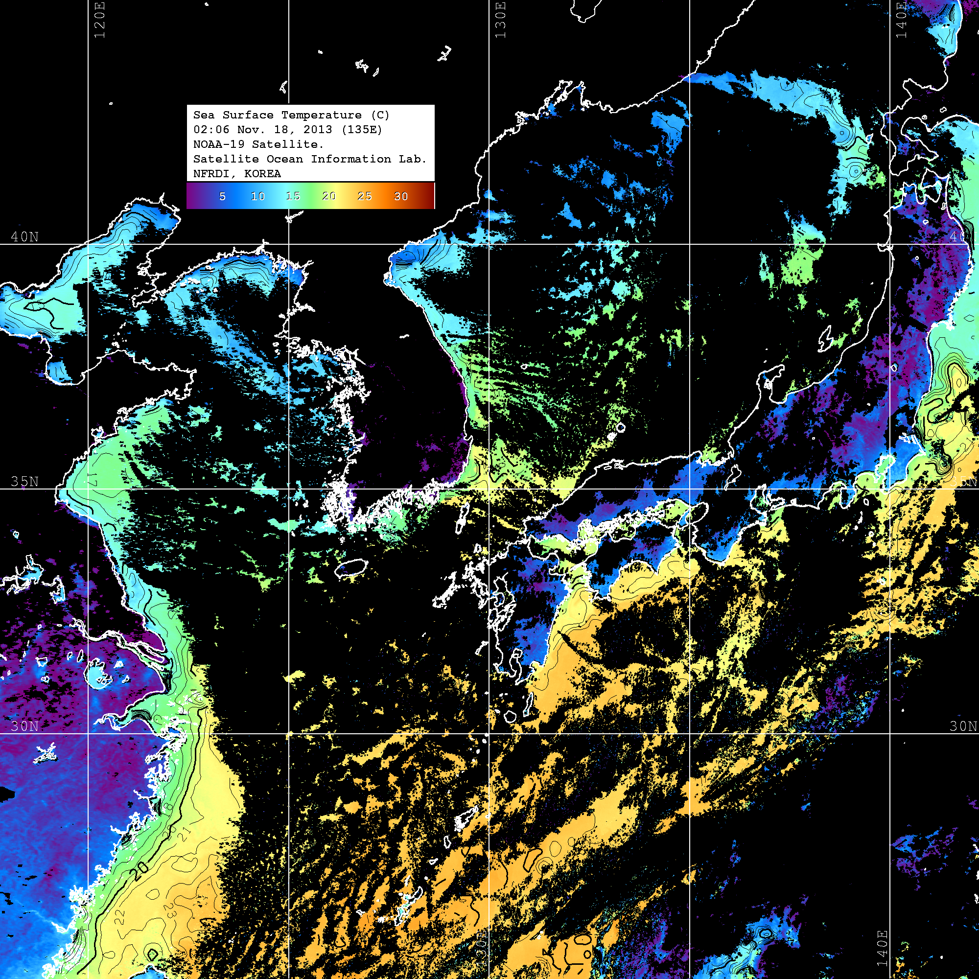 o 2013년 11월 18일 NOAA 위성영상입니다. o 영상 시간 및 수온분포는 범례를 참고하시기 바랍니다. o 검은색은 구름을 나타냅니다. o 그림을 클릭하시면 크게 보실 수 있습니다.