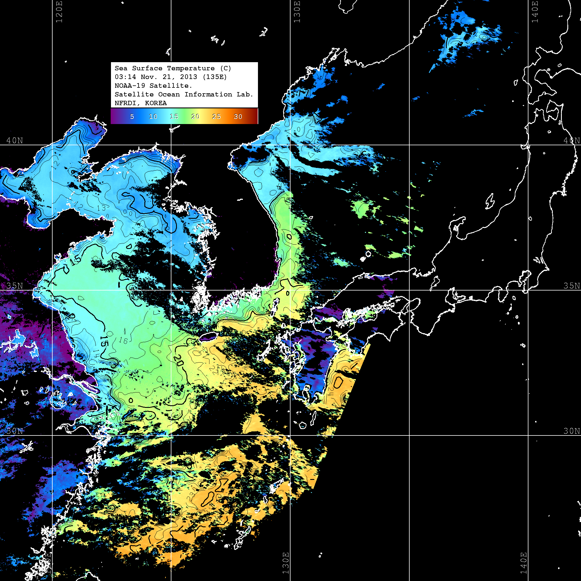 o 2013년 11월 21일 NOAA 위성영상입니다. o 영상 시간 및 수온분포는 범례를 참고하시기 바랍니다. o 검은색은 구름을 나타냅니다. o 그림을 클릭하시면 크게 보실 수 있습니다.